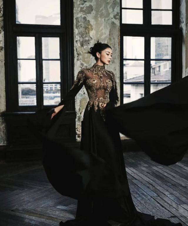 身穿黑色重工刺绣透视长裙,上半身为镂空透视薄纱,镶嵌银色亮片与彩色丝线刺绣,裙摆为拖地薄纱。