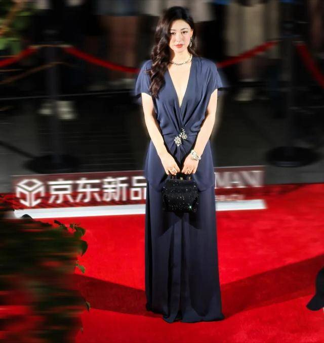 朱珠    深蓝深V开叉裙    "腰线设计显腿短"