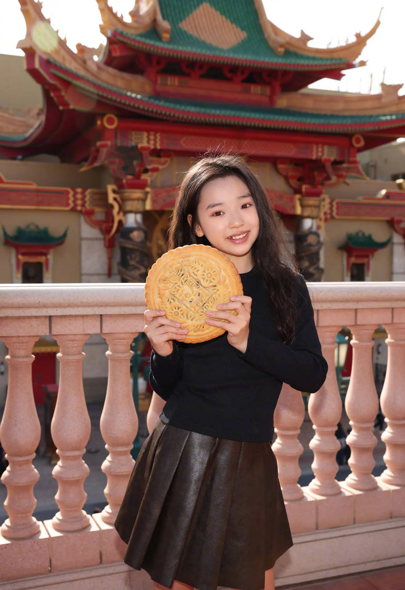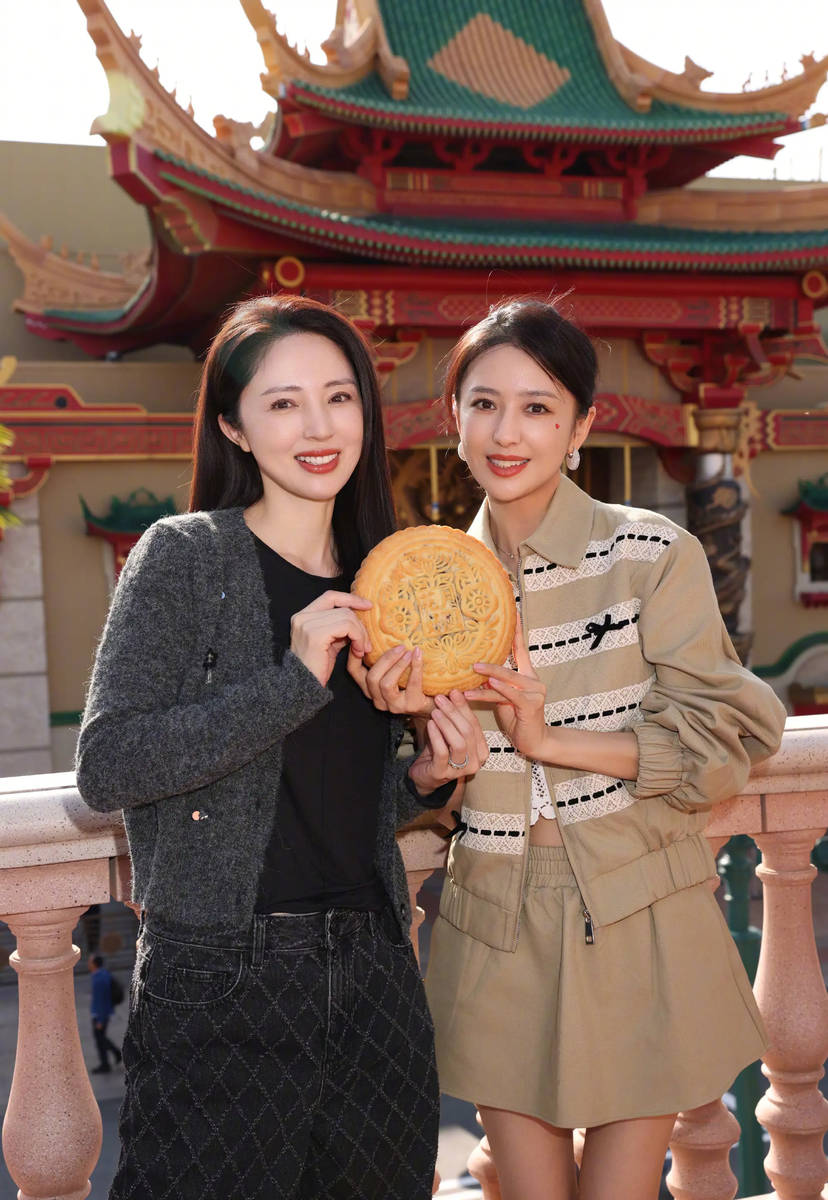 董璇与佟丽娅拿着大月饼拍照,笑容甜美迷人。