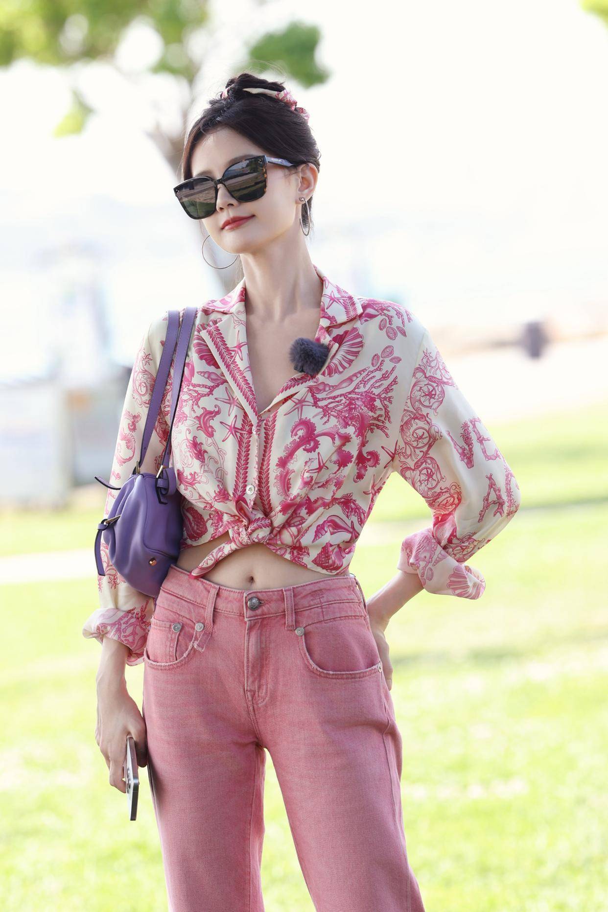 李一桐夏日出街的这套粉色系穿搭,真的太显嫩了,仿佛一下子就回到了少女时代。她穿的这件粉色印花衬衫,属于那种很有夏日氛围的单品,上面的印花图案活泼又可爱,给人一种轻松愉快的感觉。把衬衫的下摆打个结,这个小技巧真的很实用,不仅能让穿搭更有造型感,还能突出腰线,让身材比例变得更加优秀,看起来更加青春有活力,妥妥的减龄神器。