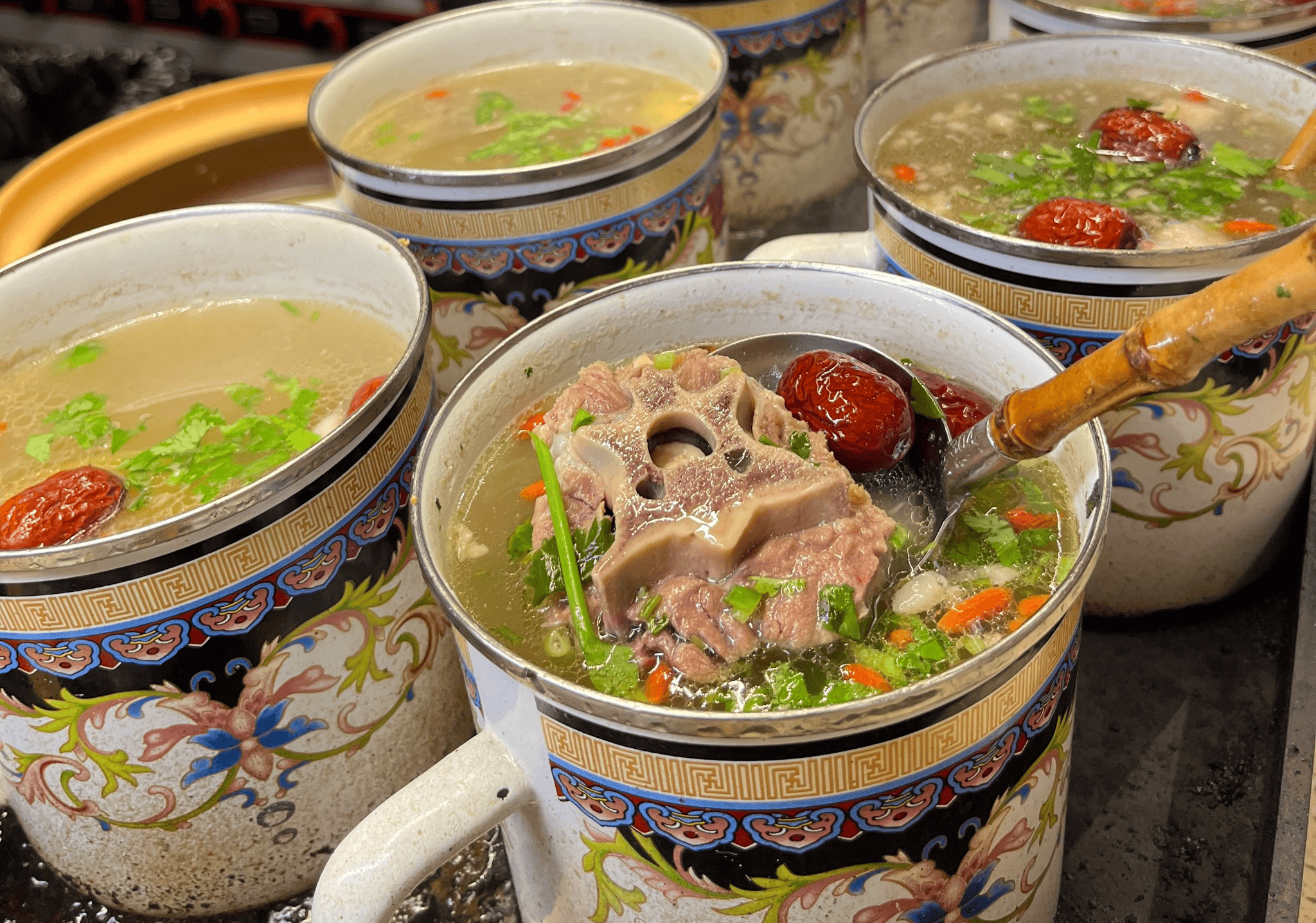 在新疆提缸子肉,没人不馋 —— 尤其是喀什的早市,满街都是搪瓷缸子的影子,缸子里炖着带骨羊肉,汤面上飘着油花,香味能勾着人挪不动脚。做缸子肉不用复杂调料,就把羊肉块放进搪瓷缸,加清水、姜片,架在火上慢炖 2 小时,炖到肉烂汤鲜就行。