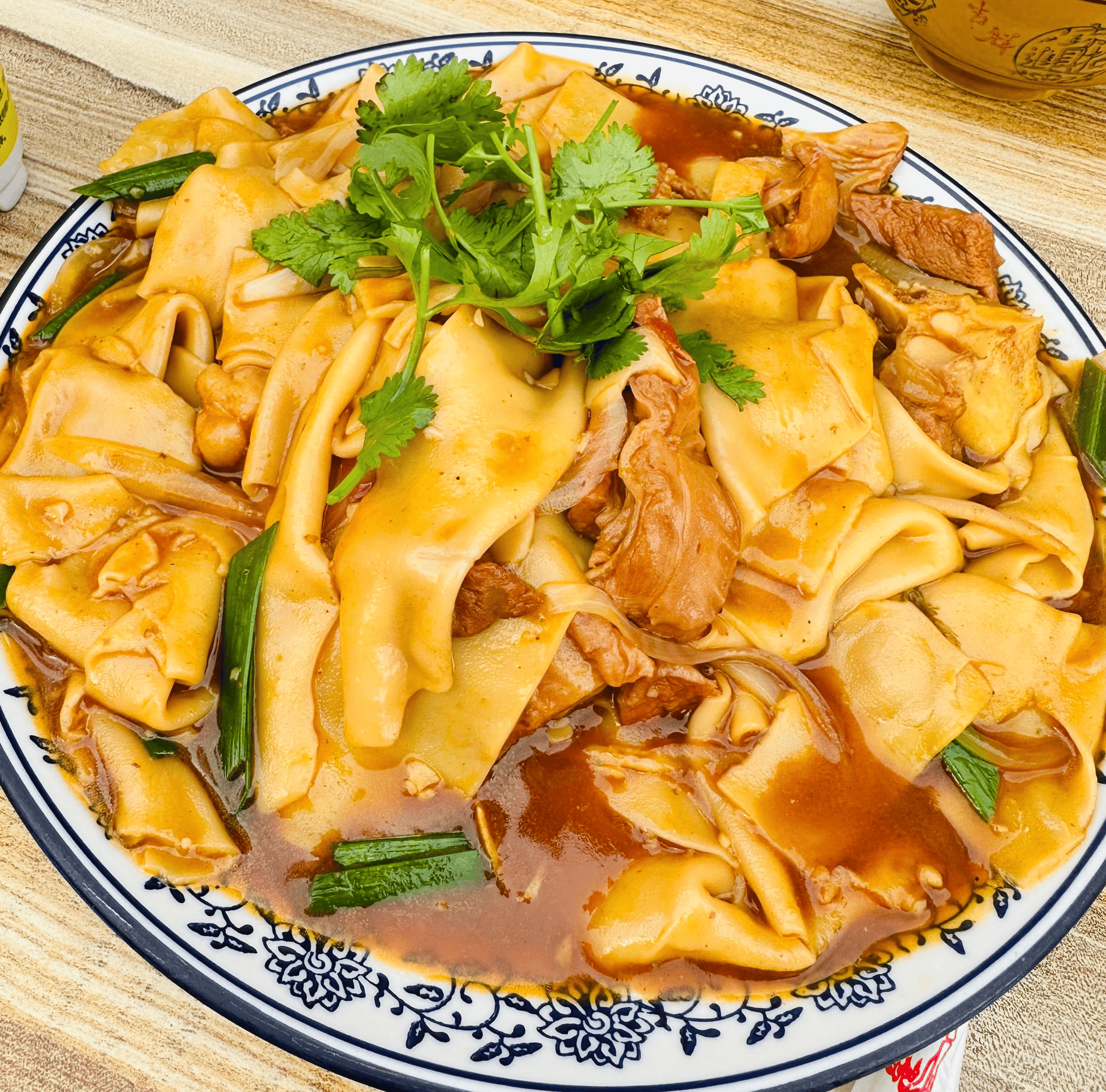 羊肉焖饼子是新疆人的 “创意菜”,端上桌看着就像个圆饼,掀开薄饼才见底下藏着惊喜 —— 焖得软烂的羊肉块,裹着浓稠的汤汁,油亮油亮的。做这菜得先把羊肉焖好,再在上面盖层擀薄的面饼,焖到饼吸满汤汁,软乎乎的能蘸着肉汁吃。