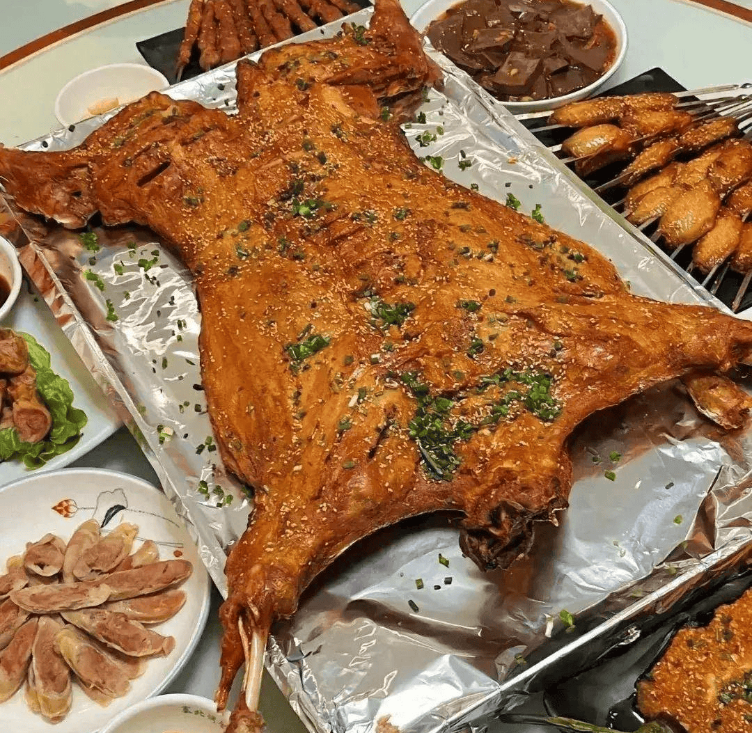 吃烤全羊得一群人围着,师傅会把羊拆成块,先抢皮吃 —— 脆得 “咔嚓” 响,嚼着满是油香;再吃里面的肉,嫩得没纤维,蘸点椒盐,鲜得让人眯眼。