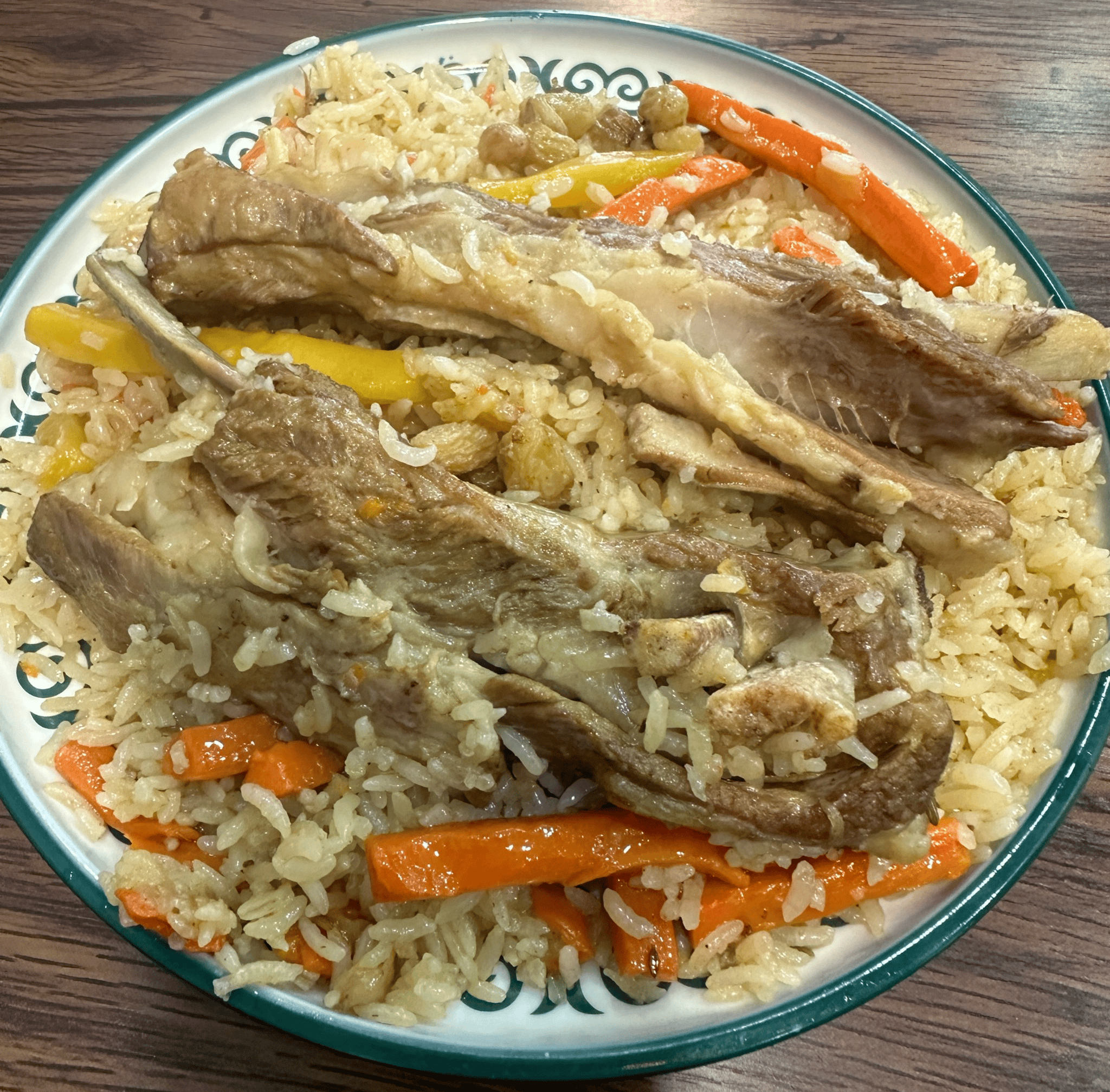 焖好的手抓饭,米粒油亮油亮的,裹着羊肉的鲜,胡萝卜甜得渗进饭里,羊肉炖得软烂,一撕就下来,连骨头缝里都挂着肉香。