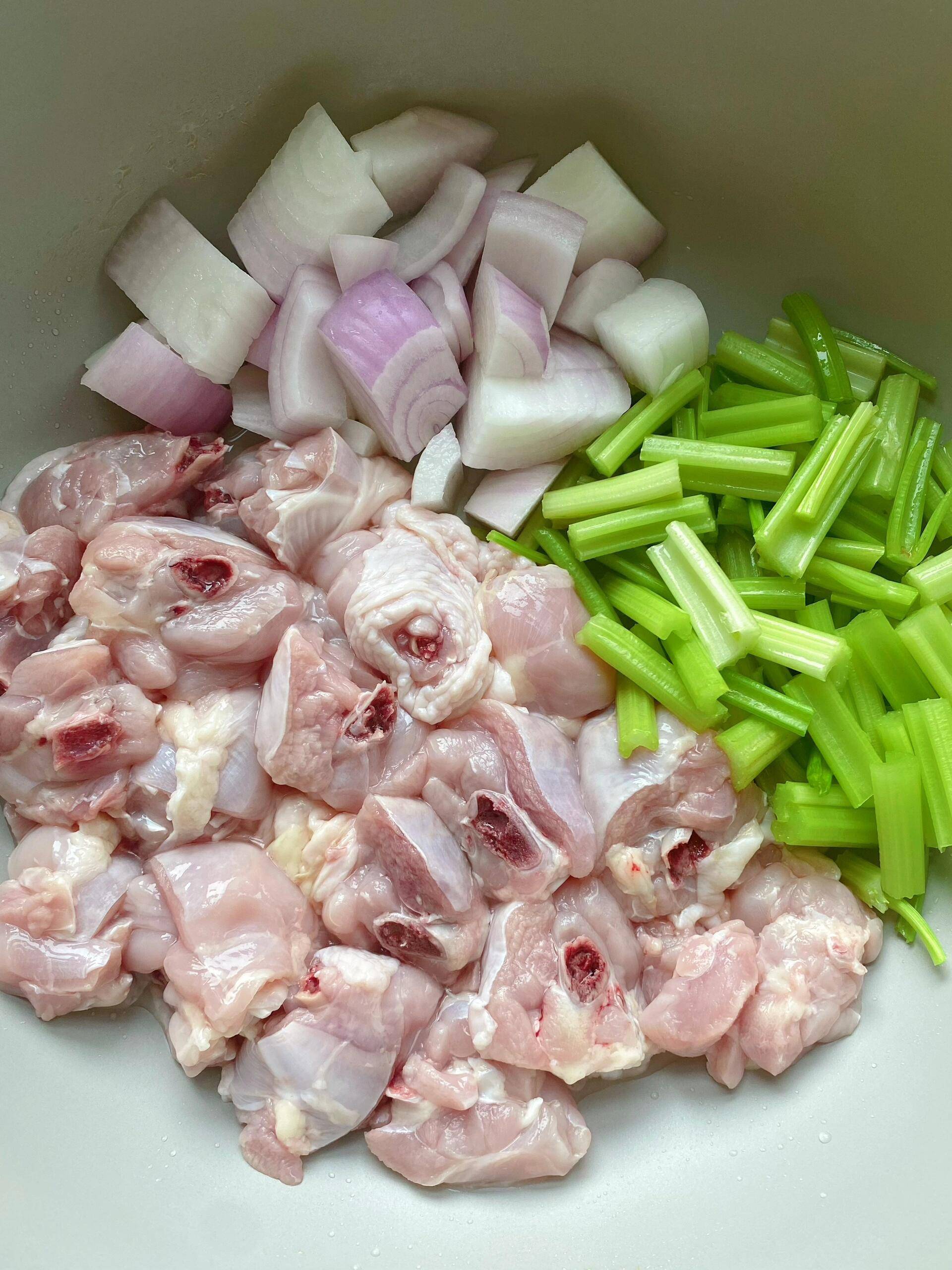 - 洋葱切块,芹菜切段,青红椒去籽切块,姜蒜切末备用。