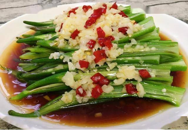 4、开大火放入秋葵,适量盐,点少许清水,拌炒几下,倒入蒜蓉再翻炒几下,出锅前淋适量花椒油就好了。