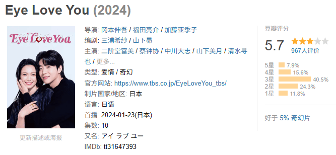 结果,豆瓣。 另一部《Eyeloveyou》评价还没前者高呢。 二阶堂富美搭档出演过《棒球大联盟》《无法抗拒的他》的韩国演员蔡钟协。 结果又是日韩畸形杂交剧本,为单薄噱头狂砸人工糖精。