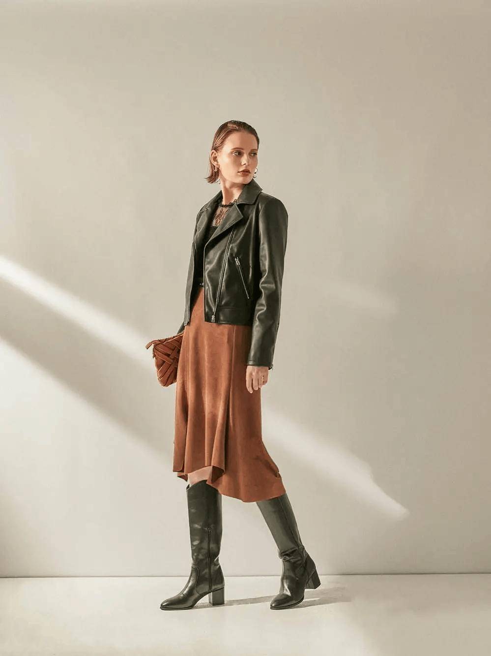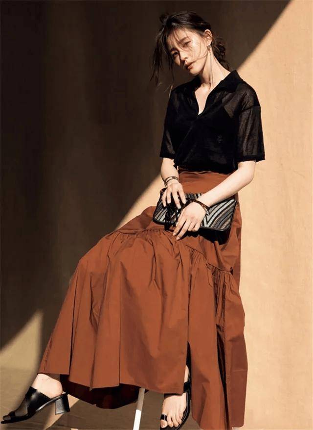 硬核单品中和 用硬朗单品削弱甜腻感 焦糖色长裙+黑色尖头猫跟靴