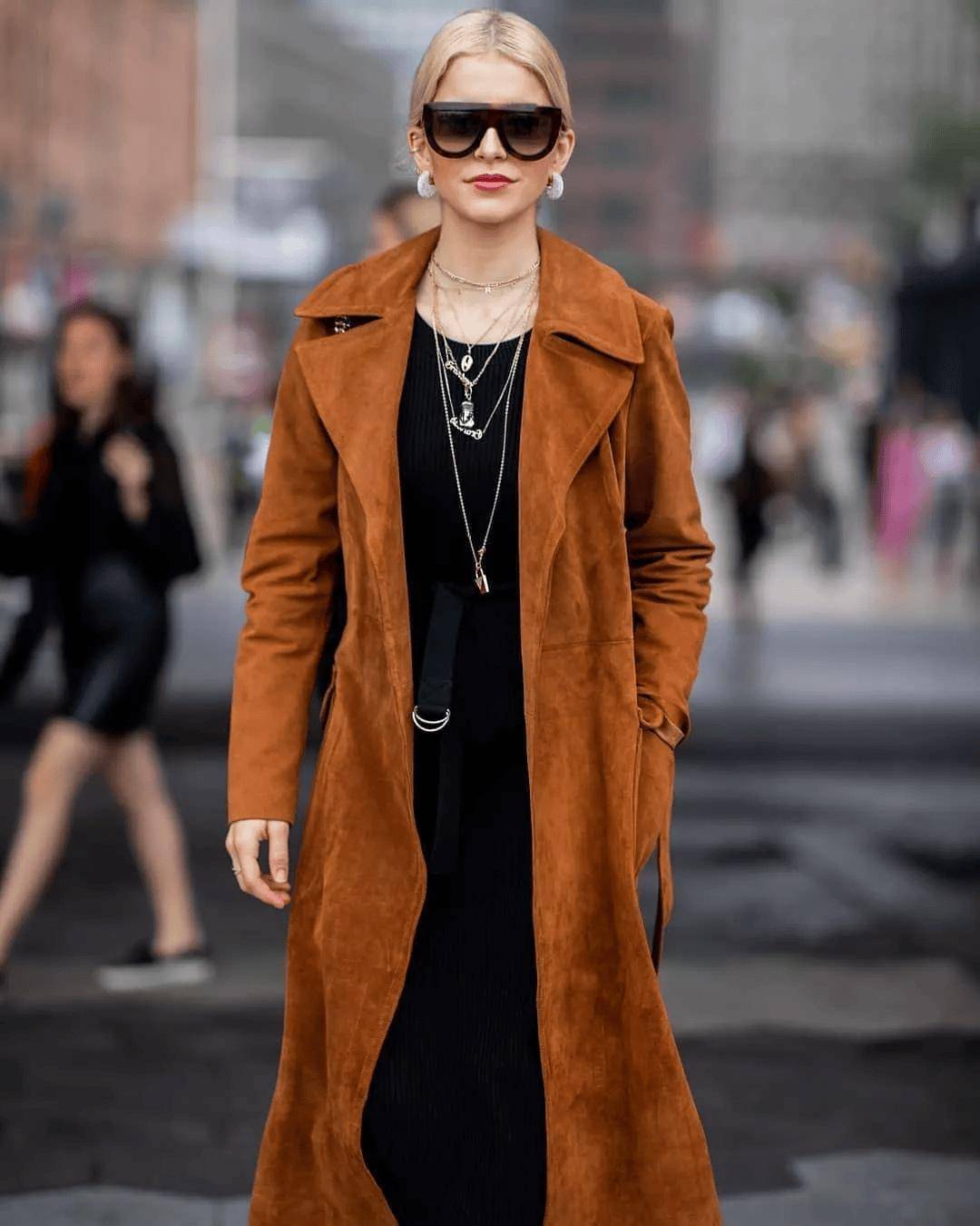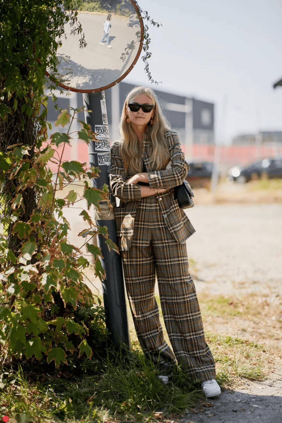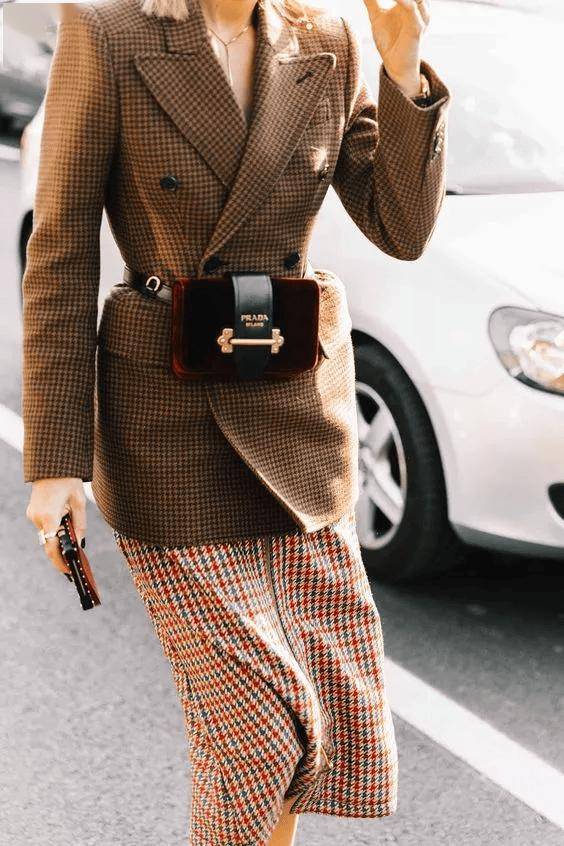 同色系延伸 深浅层次增强纵深感 焦糖色麂皮外套+咖色格子伞裙+焦糖靴