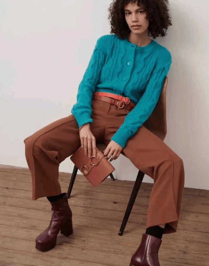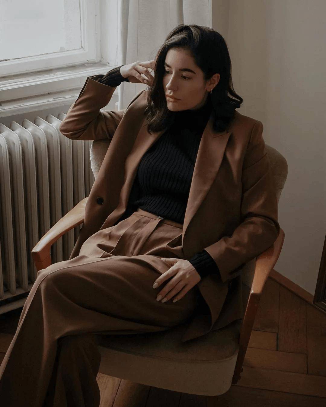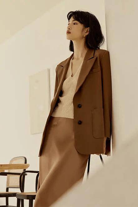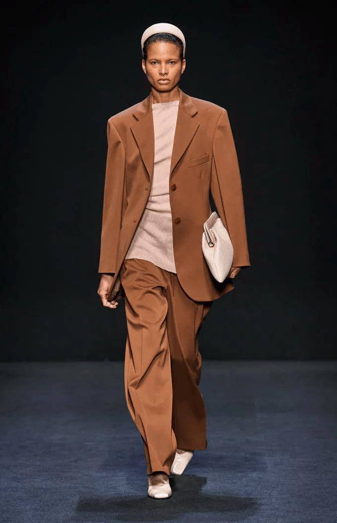 焦糖色的包容性使其成为跨风格「万能色」:既能通过军装风大衣展现桀骜力量1,也能以针织拼接设计传递田园慵懒。其在色彩体系中承上启下——衔接大地色系的沉稳,又为浆果红、苔藓绿等亮色提供中和基底,最终以「不费力的高级感」成为2025秋冬的色彩锚点