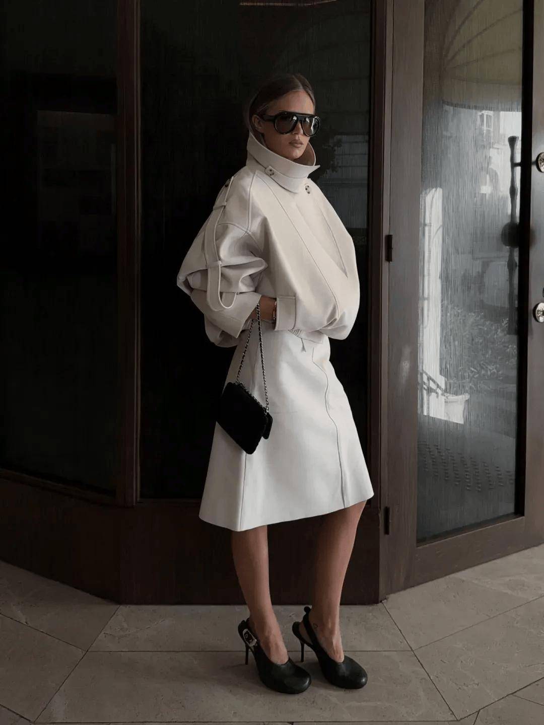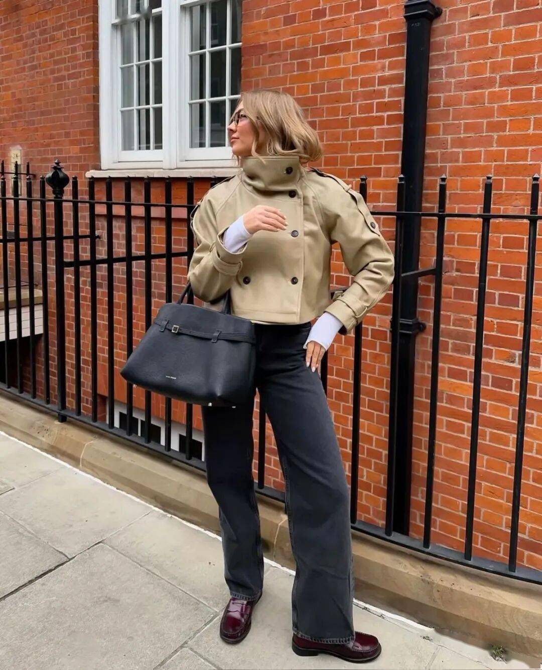 短风衣本就讲究简洁利落,搭配漏斗领后,整体线条更显紧凑。领部结构取代了传统翻领的开放感,视觉重心自然上移,使人看起来更为修长挺拔。