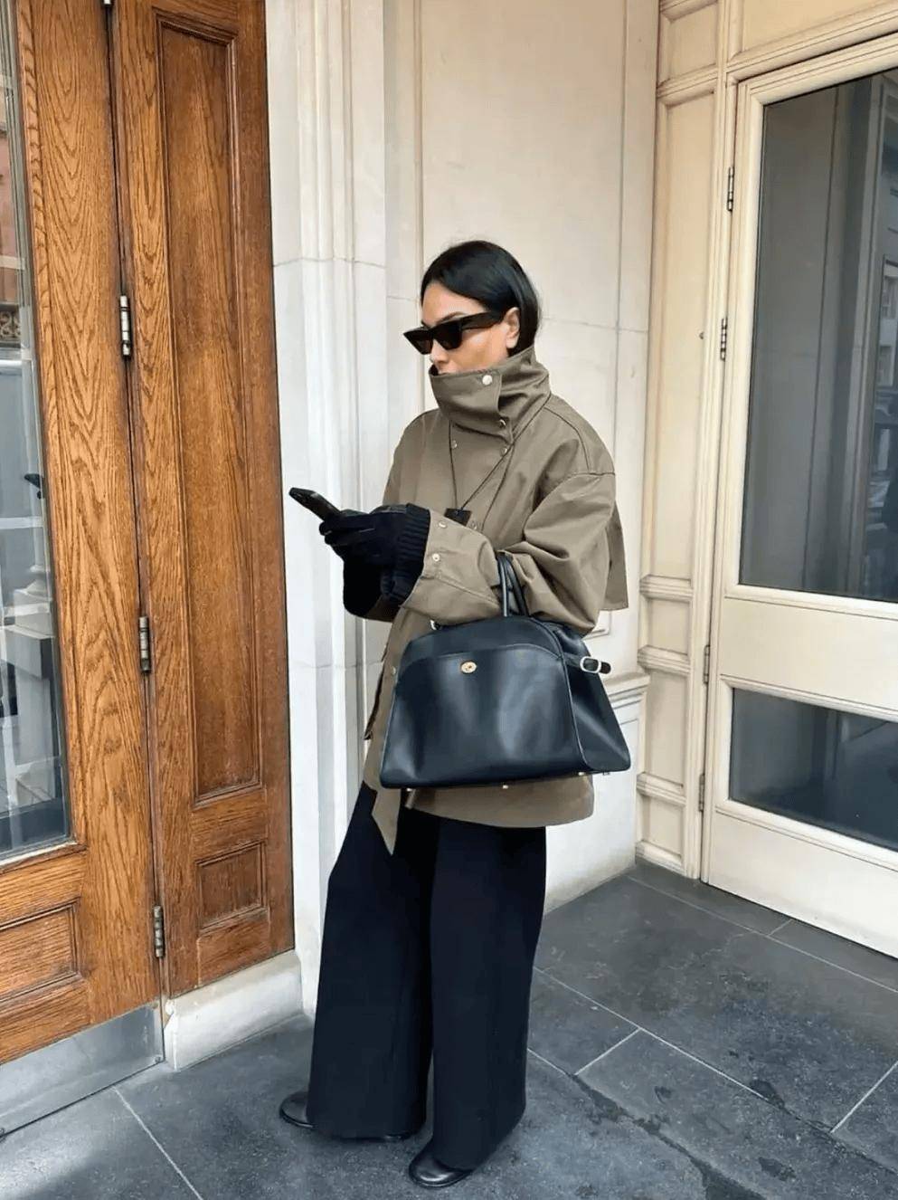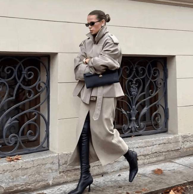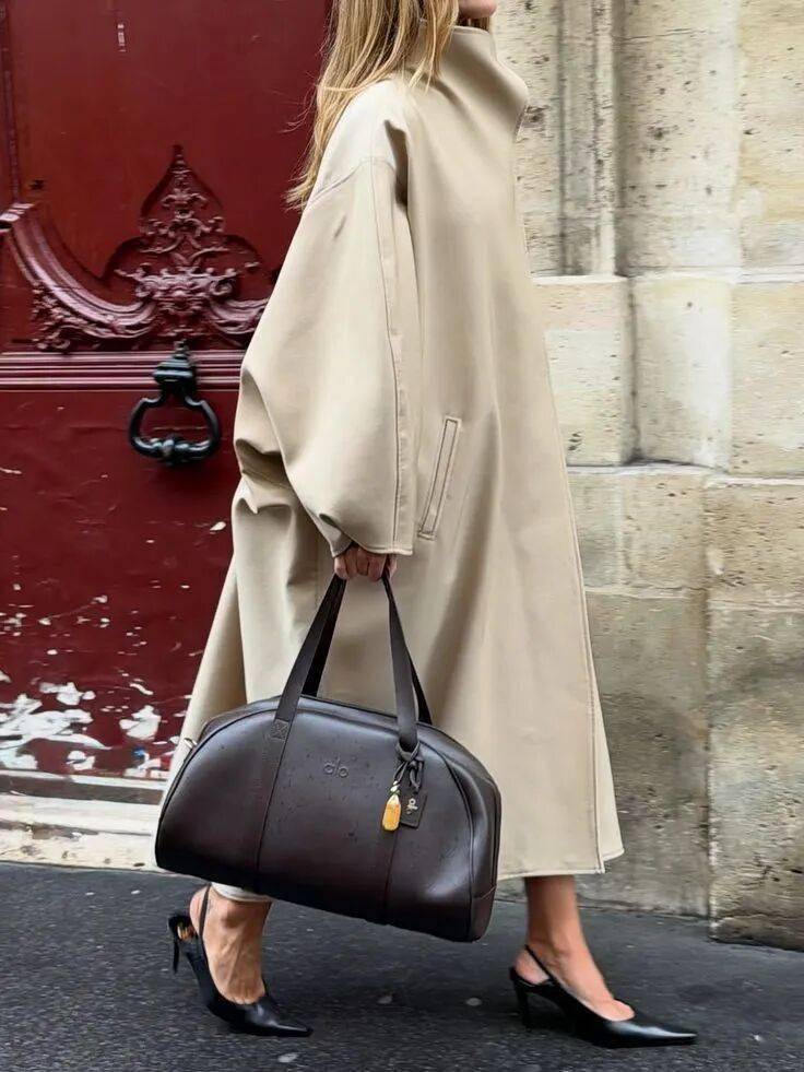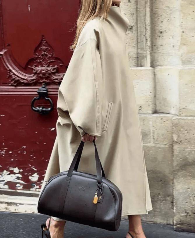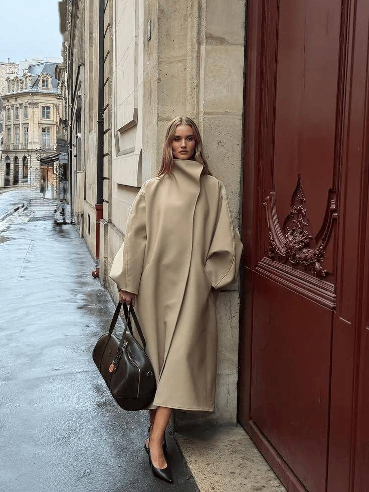 漏斗领长风衣    柔和感:领口宽、弧度圆润、面料柔软    内搭高领针织,下装配直筒裤