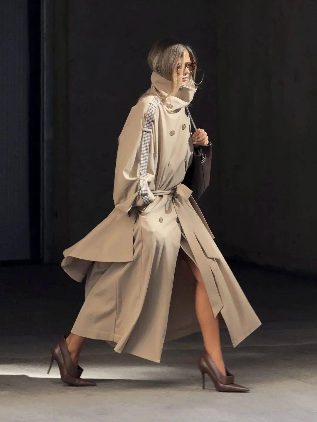 漏斗领短风衣,行走时衣摆随风轻扬,
