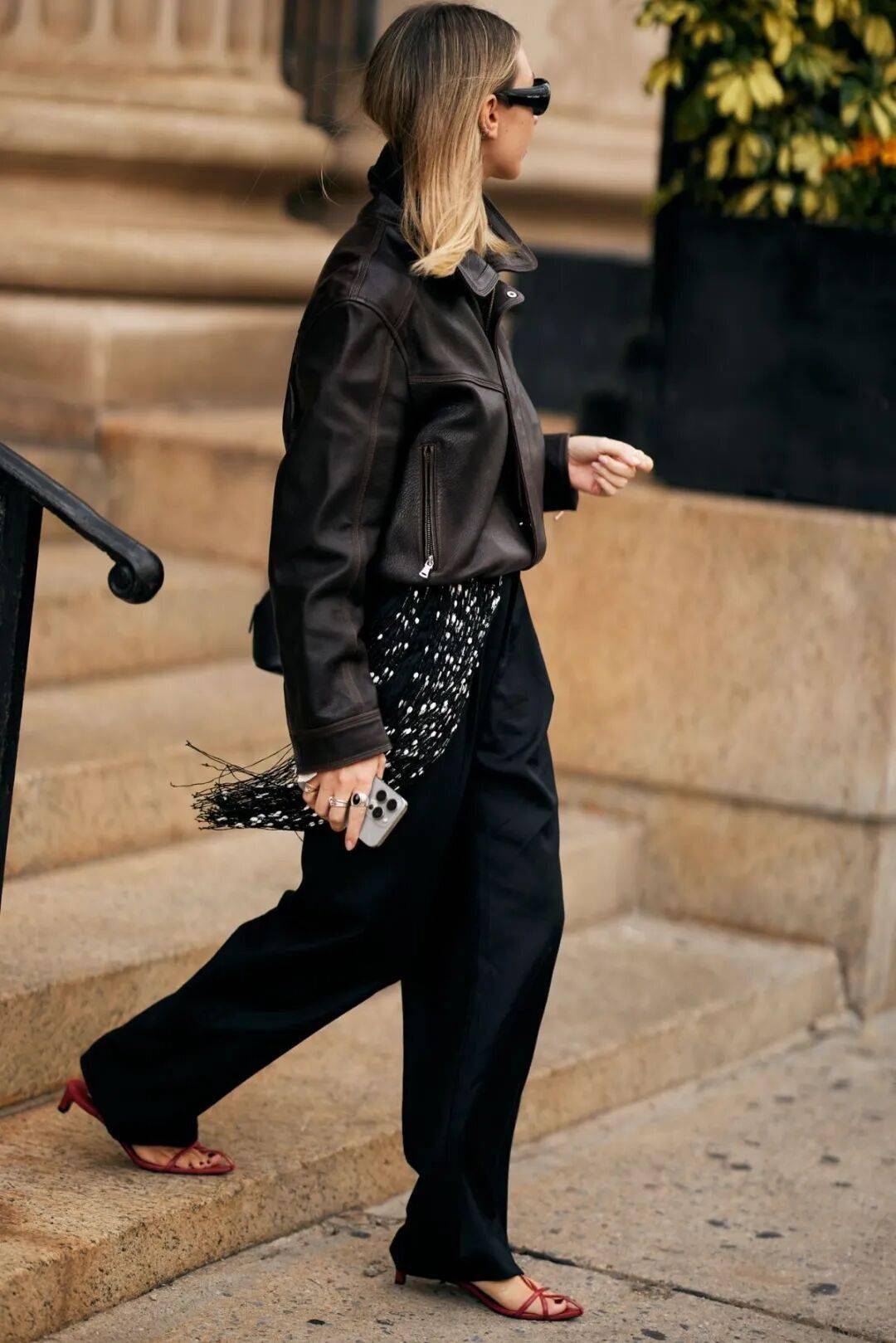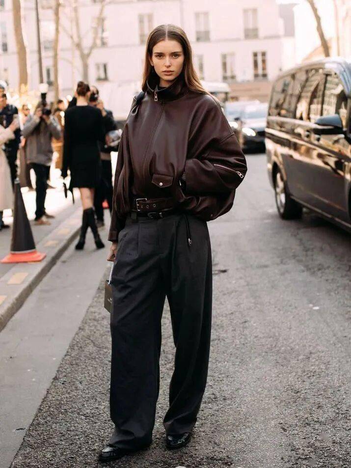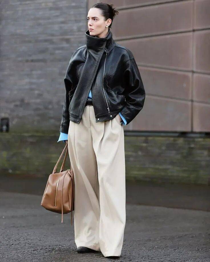 漏斗领皮夹克    短款(臀上/刚过臀)、肩线外扩、拉链居中    搭配微喇裤,鞋履呼应外套颜色