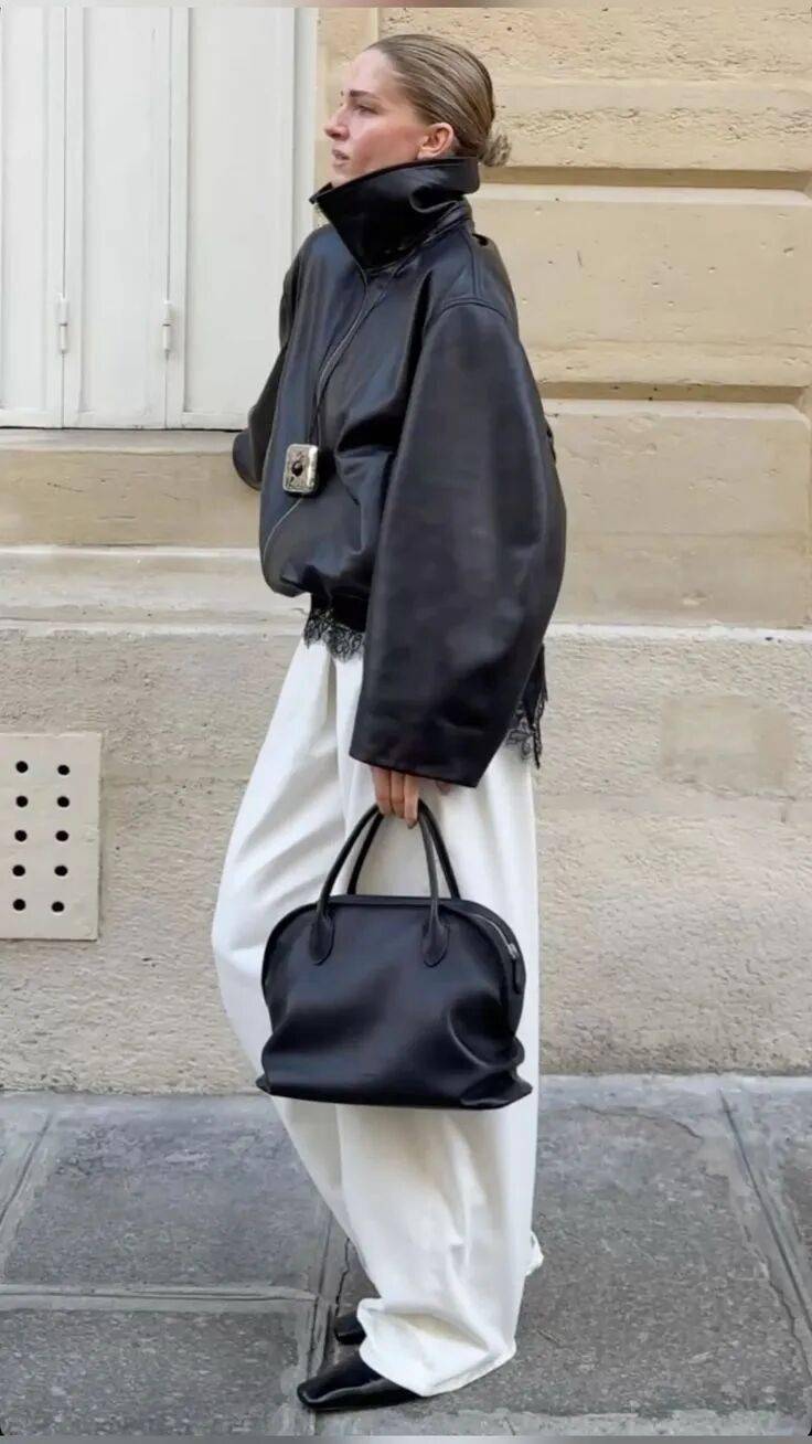为保持领型的挺拔度,建议选择具有一定厚度的皮革。羊皮细腻并带有微妙光泽,牛皮硬挺则支撑更强。肩线略向外扩展或拉链居中的款式,能与立领形成横纵对比,进一步强化结构语言。