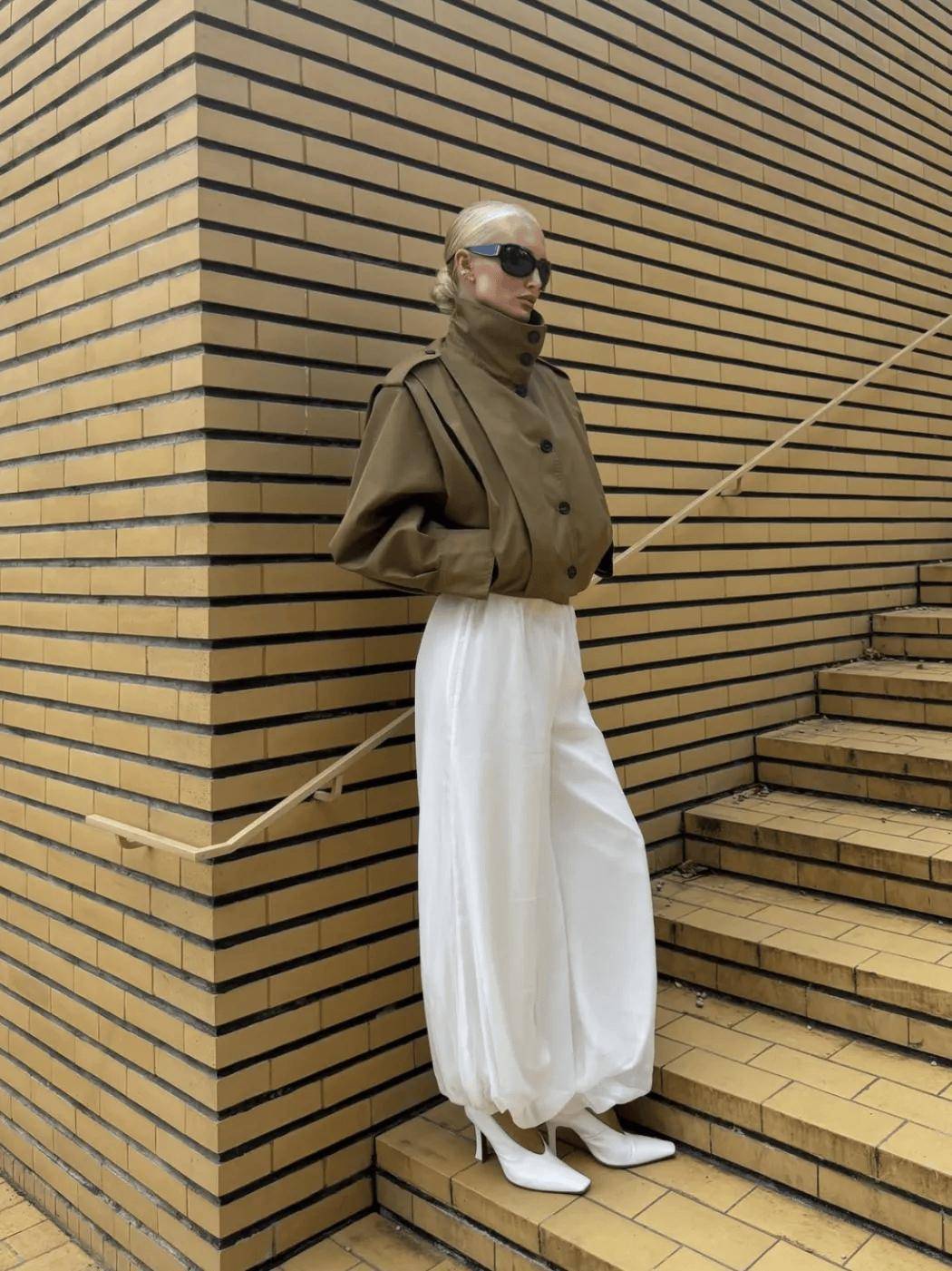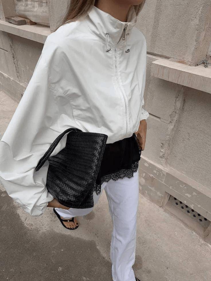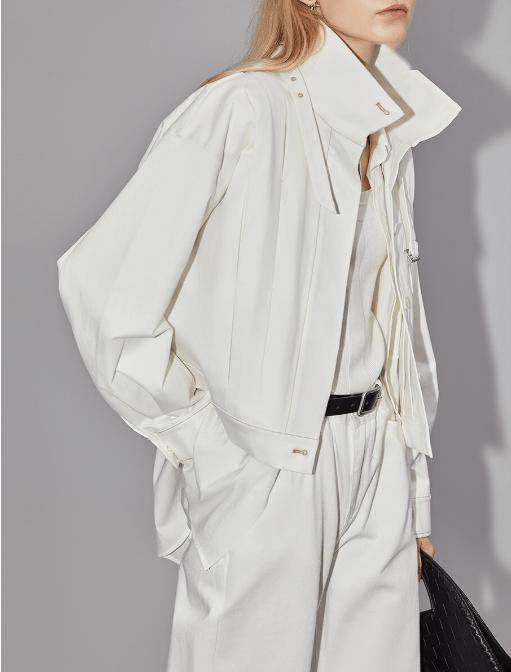 漏斗领短风衣    轻防风尼龙材质、领口立体弧度    内搭白色打底,下装选阔腿裤