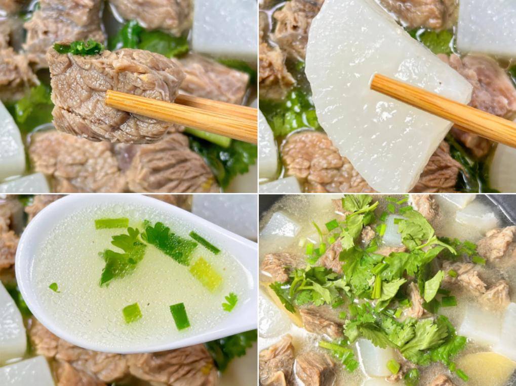 5、白萝卜去皮切滚刀块,放入锅中,继续小火焖煮 30 分钟,让白萝卜吸收牛腩的鲜味,同时煮至软嫩适口。