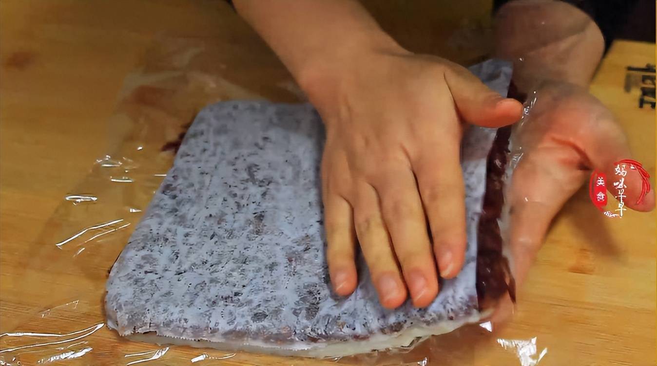 5,蒸好后稍微放凉一些,然后用小刀在四边划一下,方便脱模,接着再铺上保鲜膜,给它倒扣过来脱模,将米糕翻过来,撕掉保鲜膜。