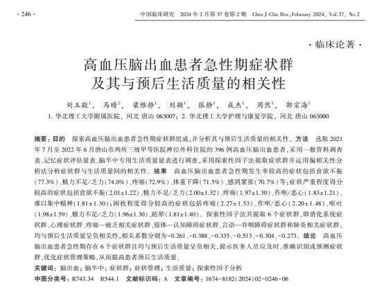 刘玉敬,马晴,梁雅静,刘颖,张静,成杰,周然,郭宗海,高血压脑出血患者急性期症状群及其与预后生活质量的相关性,中国临床研究,2024-02-20