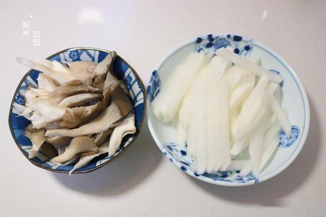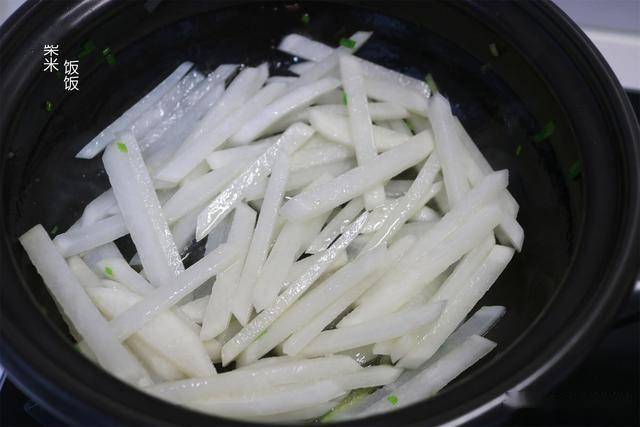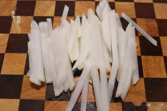 1,白萝卜去皮,先切厚片,再切条。不要切太细,煮的时候容易碎。