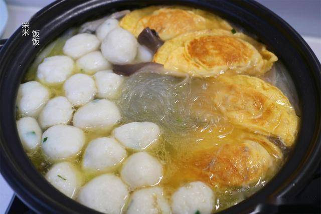 7,鱼丸、蛋饺煮熟,放入泡软的粉丝,再煮一分钟就好了。