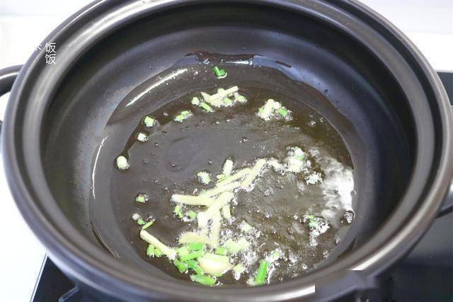 爆香底料:热锅加油,爆香葱姜后加入虾仁及泡虾仁的水。
