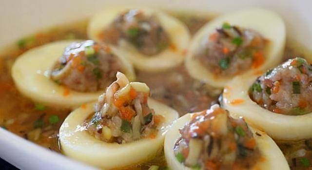 1、鸡蛋洗净,入冷水锅煮熟。捞出去壳切两半,取出蛋黄,留蛋白备用;猪肉馅加入盐、蚝油、料酒、葱末、用勺子搅拌均匀;用勺子挖出部分肉馅团成丸子,酿入鸡蛋白内