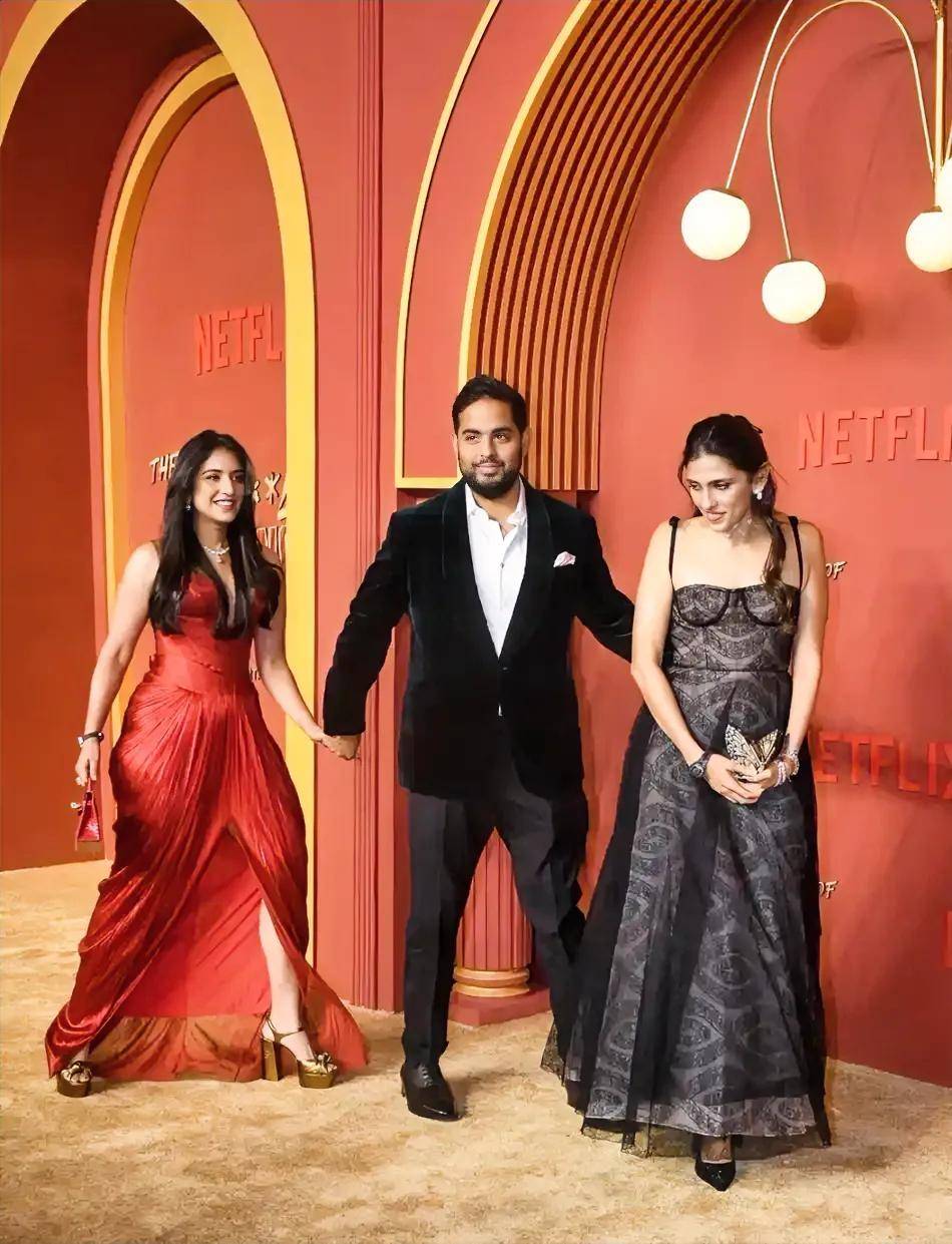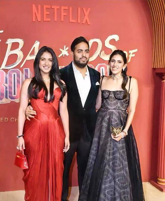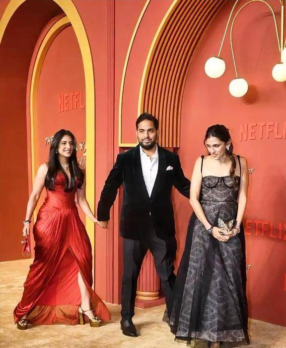 拉迪卡自学生时代便与阿南特成为情侣,早早被安巴尼家族接纳,六七年前就正式进入穆克什家族,并被夫妇二人视如己出。她性格活泼,幽默机智,又大大咧咧不拘小节,因此深受家人喜爱。生日宴上,她甚至与公公穆克什互喂蛋糕,场面温馨趣味。然而,近日她随大伯哥阿克什夫妇走红毯时的举动却引起舆论关注。当日阿克什夫妇和拉迪卡盛装出席,拉迪卡身着红裙,长发披肩,尽显惊艳,但丈夫阿南特因健康原因未现身。阿克什牵着拉迪卡步入会场,手势紧扶腰部,引发媒体热议,被认为有失分寸。梅塔虽然面带微笑,目光却意味深长地回望这一幕。