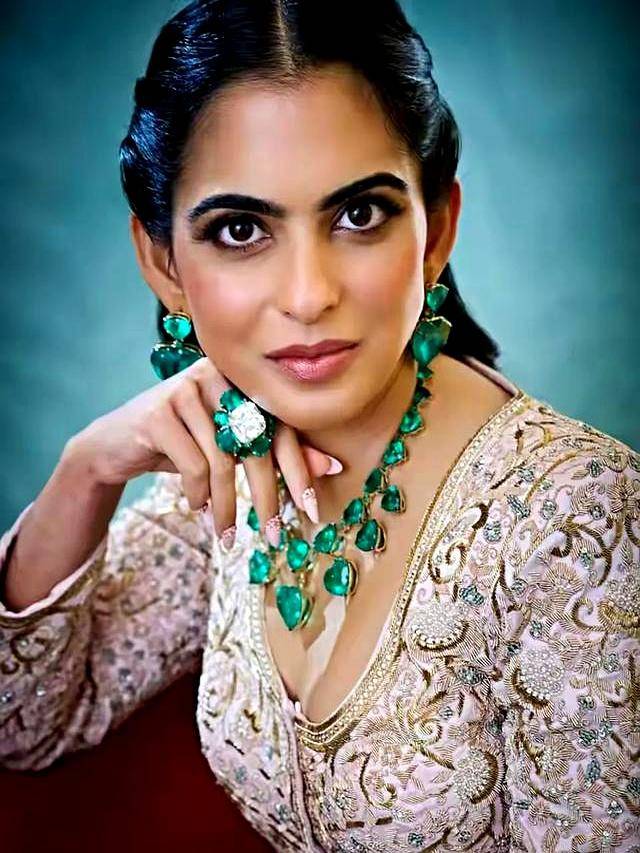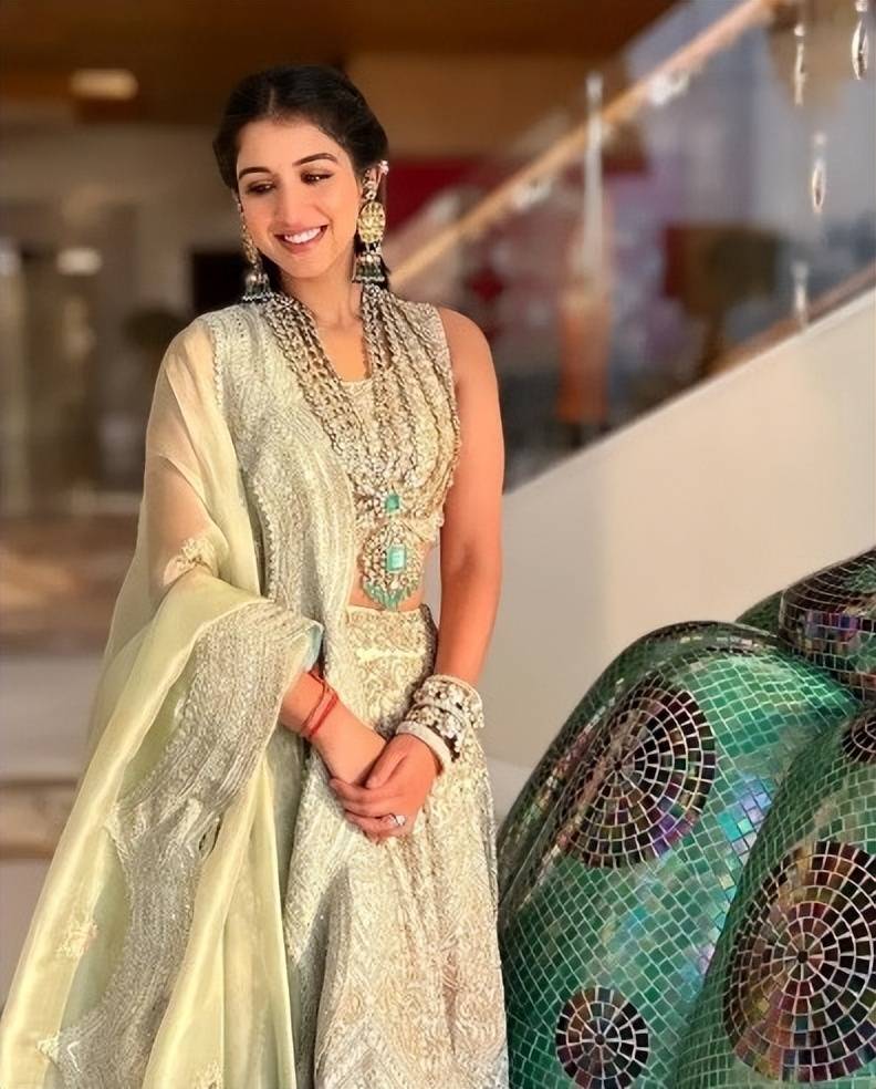 妮塔向来以大手笔和喜爱分享著称。在家里,她不仅自己穿着奢华,还将这一标准扩展到儿媳和女儿身上,让她们也打扮得如富贵花般光彩照人。或许正是出于这样的偏爱,妮塔送给小儿媳一套奢华的珠宝并不令人惊讶。拉迪卡曾佩戴过一套钻石祖母绿套装,钻石与祖母绿宝石相得益彰,极其奢华。这套珠宝与妮塔曾佩戴的款式如出一辙,似乎是妮塔为小儿媳精心挑选的结婚礼物。