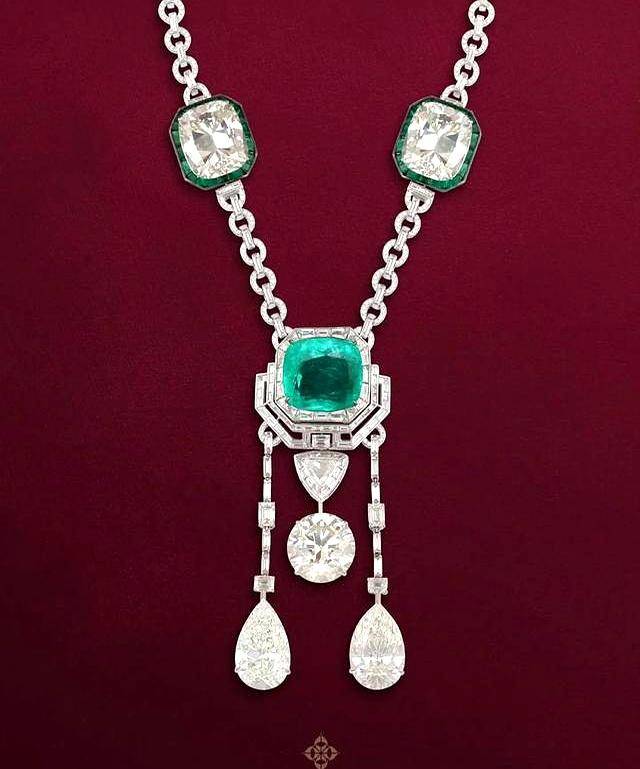 祖母绿全是哥伦比亚穆索矿的极品,色泽浓郁饱满,心形和水滴切割混搭,金底托钻,设计有点皇家风范。