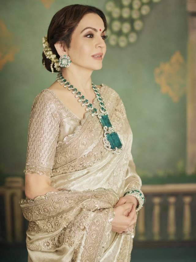 岁月在妮塔身上留下了痕迹。约六十岁的她,脖颈处的皮肤略显松弛,但依旧保持了优雅与美丽。巨大的祖母绿心形耳坠巧妙地分散了视线,掩饰了些许岁月的痕迹,也让她的气质更显高贵。天生的贵命加上穆克什无微不至的宠爱,让她成为家族中无可替代的女性。