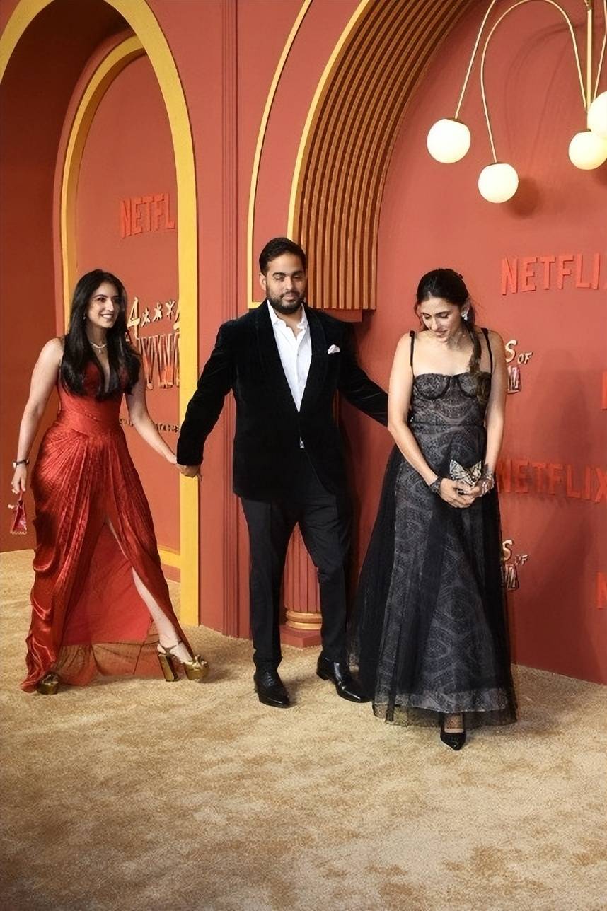当天阿克什夫妇和拉迪卡都盛装亮相,特别是拉迪卡,她穿着一条红裙子,披着一头飘逸的长发,真是让人眼前一亮。