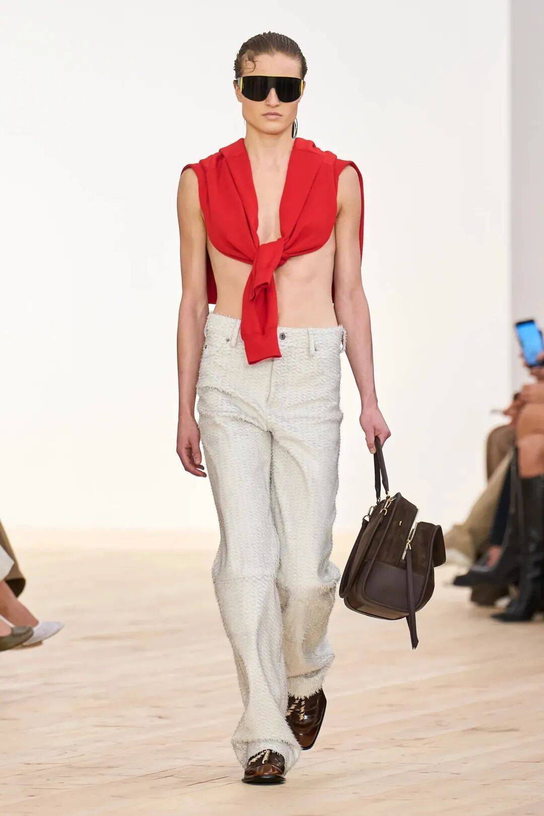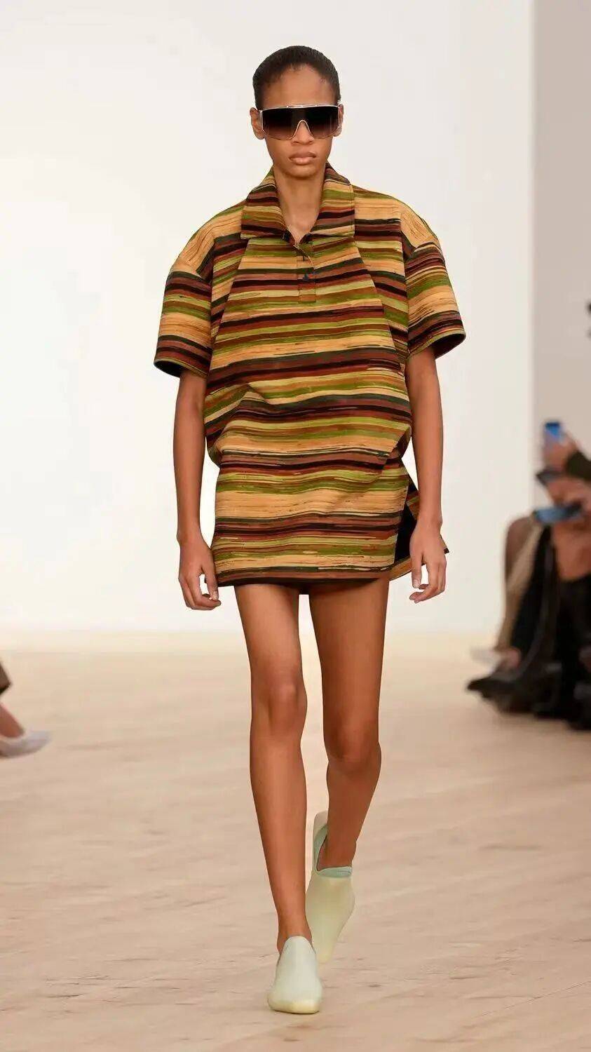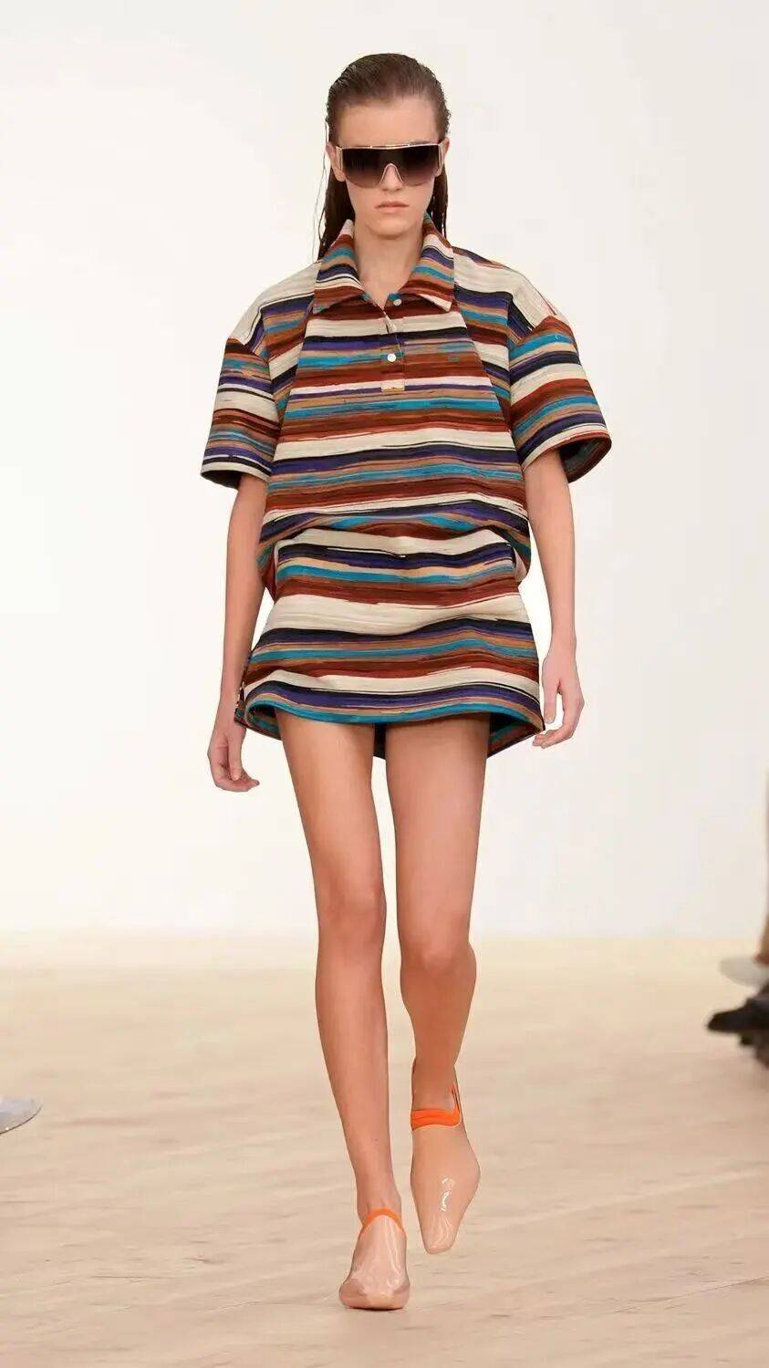 工艺升级:看似亚麻布的条纹上衣实为皮革编织,与玻璃包共同体现“以硬塑软”的材质实验。