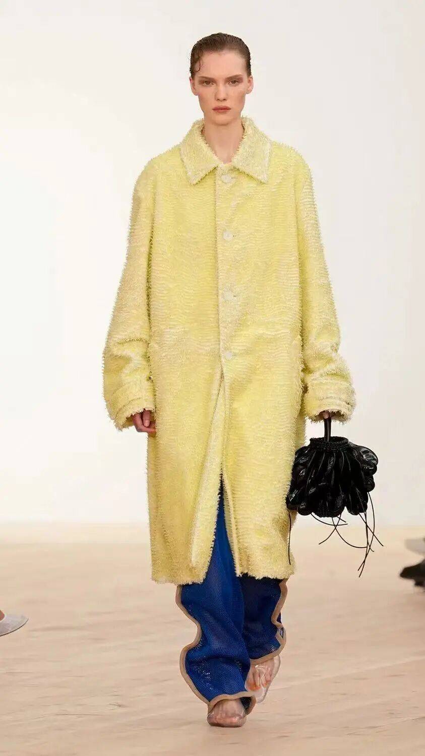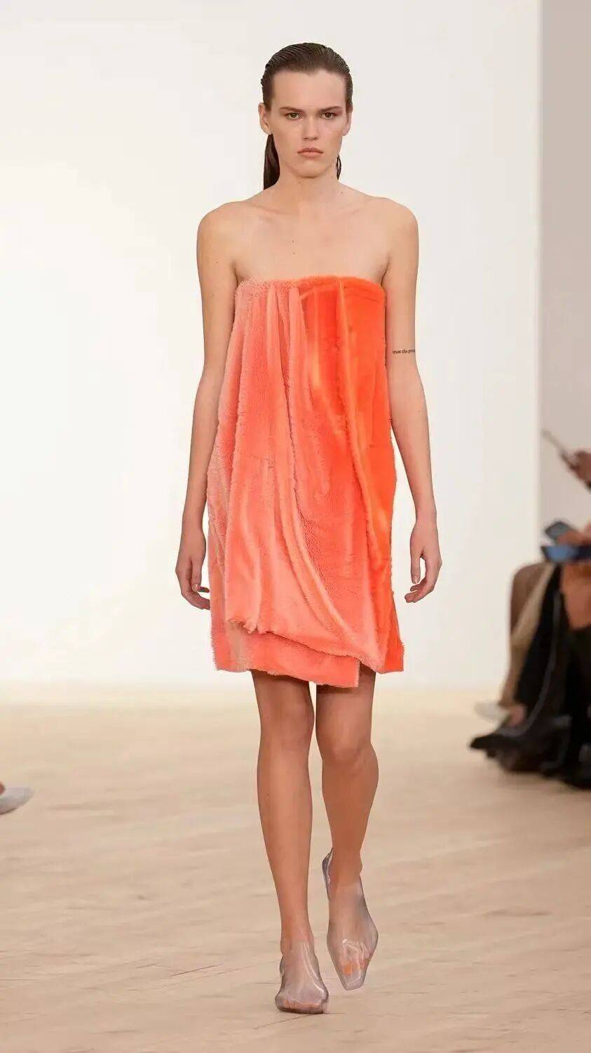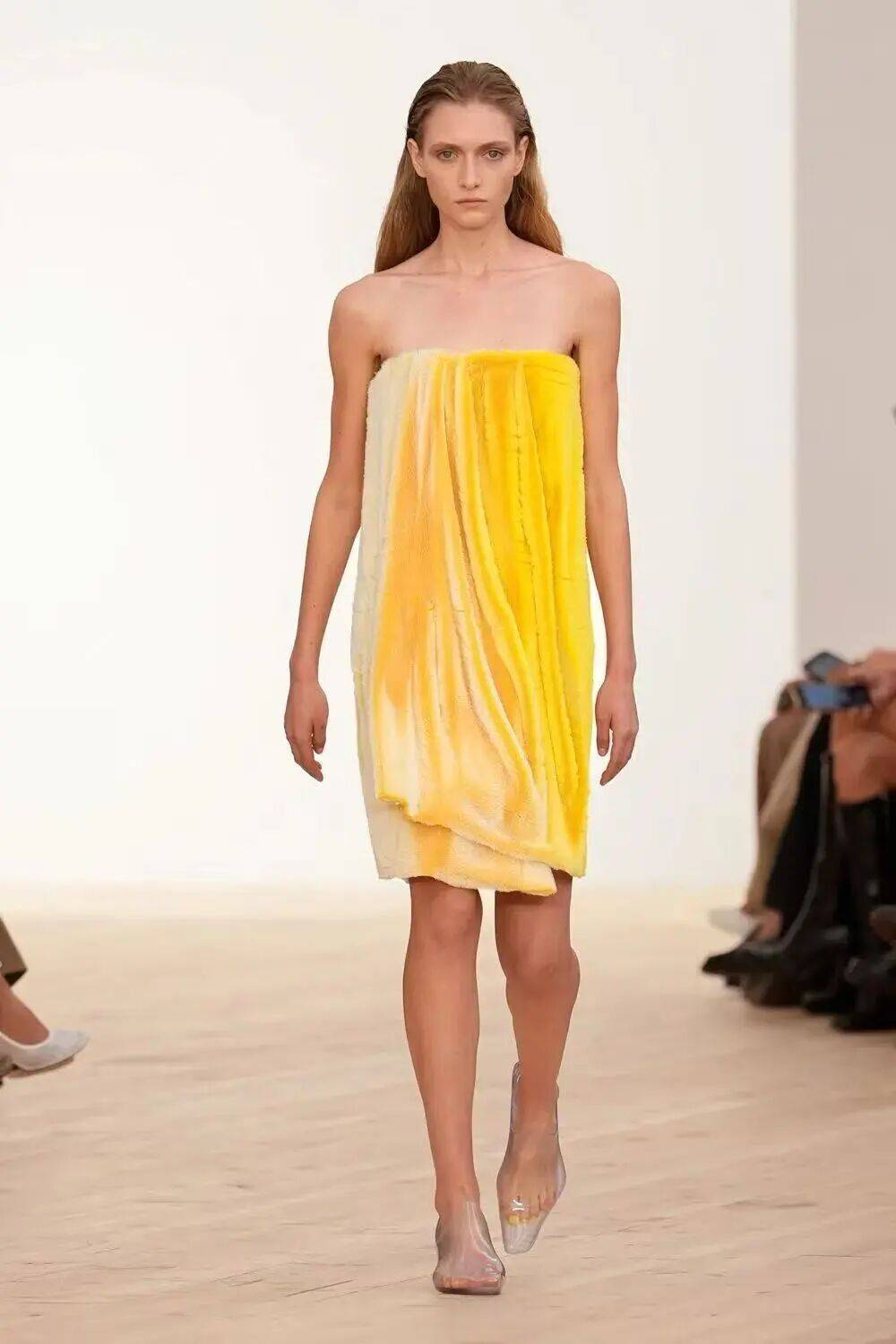 设计亮点:模特看似随意围裹的黄色“浴巾”,实则为天鹅绒面料精工制作,通过褶皱与垂坠感营造慵懒又不失精致的视觉效果。