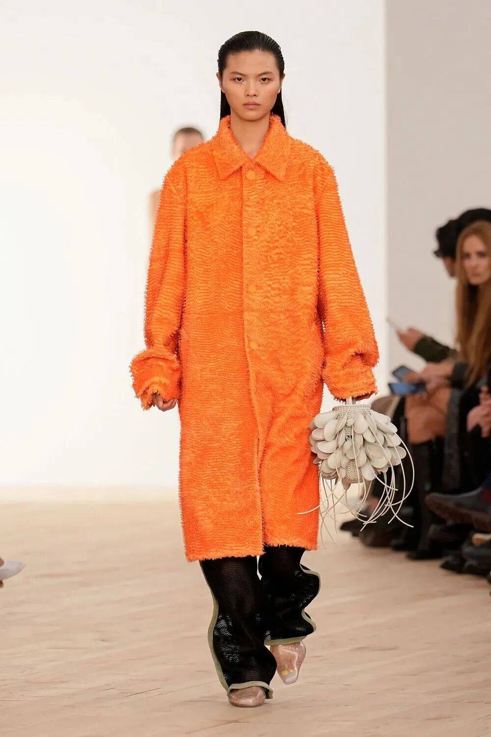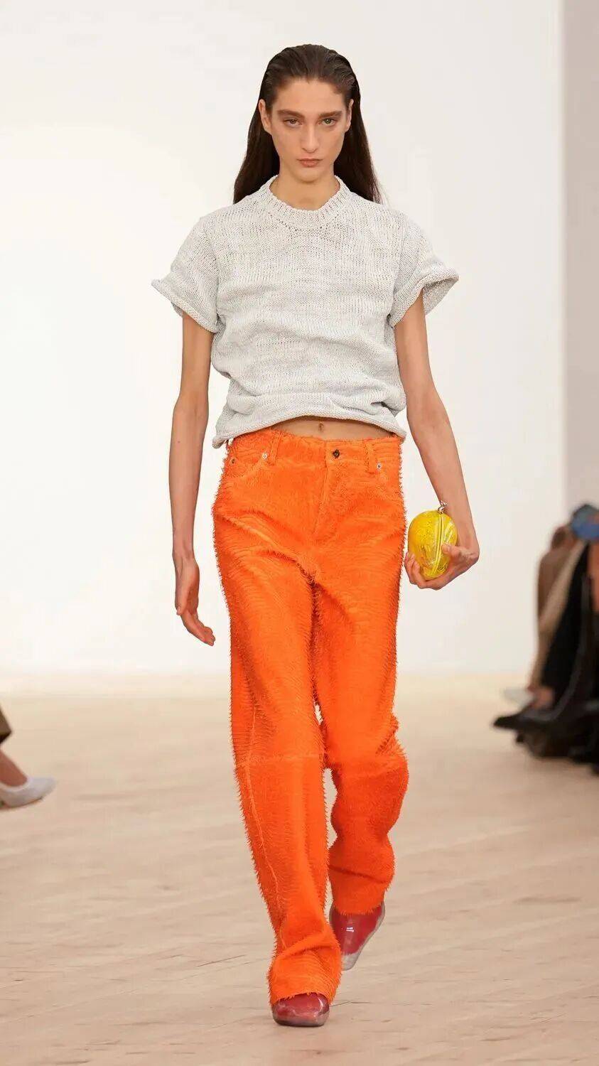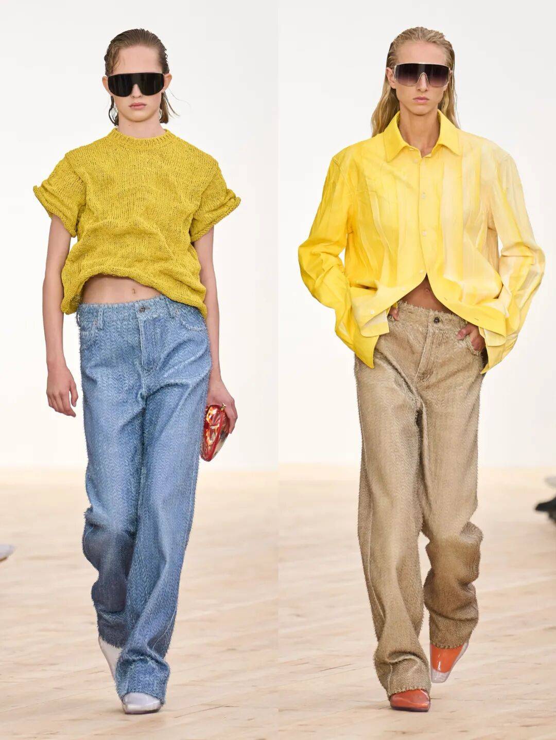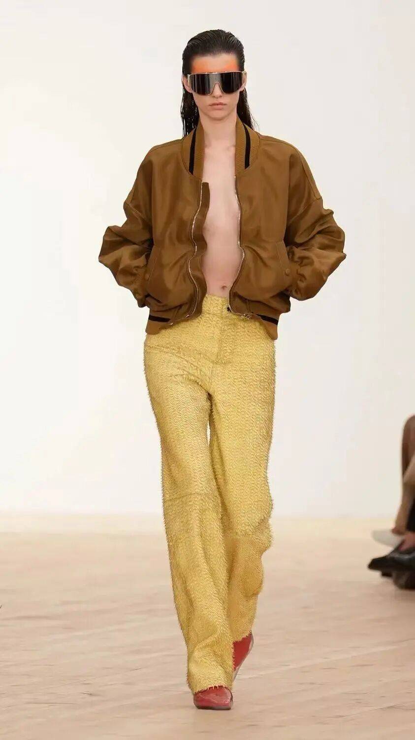 设计亮点:模特看似随意围裹的黄色“浴巾”,实则为天鹅绒面料精工制作,通过褶皱与垂坠感营造慵懒又不失精致的视觉效果。