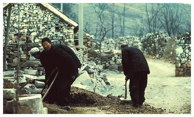 ▲ 1973年,河北遵化的三位农村老人正在用乱石修建墙壁。虽然是冬季农闲时节,但这些已经被生活压弯腰的老人依然忙碌,不愿闲下来。这样的场景在当时的农村很常见。