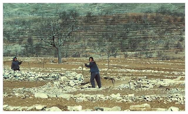 ▲ 1973年,两位农村妇女挑着扁担搬运石头,用来平整土地。由于土地贫瘠,这些石头可以有效防止水土流失,帮助保持土地的肥力。