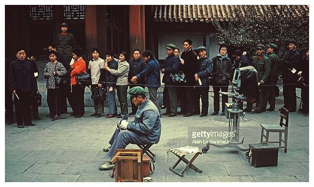 ▲ 1979年,一位老年人坐在小凳子上,用照相机拍照,旁边排着长长的等待队伍。当时的旅游景点,游客们的照片大多是同样的角度、同样的背景,几乎没有什么创意,千篇一律。