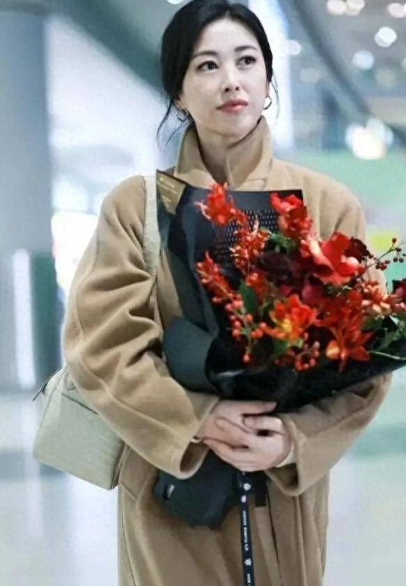 第一张图,这是一张机场场景的街拍图:画面中的女性身着浅驼色宽松长款大衣,搭配简约的浅色单肩包,整体造型是舒适的都市通勤风格;她怀中抱着一束以红色为主色调的花束(包装为黑色),鲜艳的花材与柔和的大衣色调形成对比,增添了氛围感;背景是机场明亮的廊桥空间,光线柔和,整体氛围松弛又带点生活气息,展现出日常出行中的随性优雅。