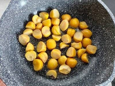 煮好的板栗擦干表面水分,用油煎30秒左右,盛出备用。