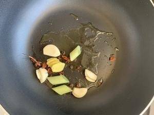 爆香葱香蒜:前面煎过板栗的油不用倒,放入葱白、姜片和拍过的蒜,爆香。