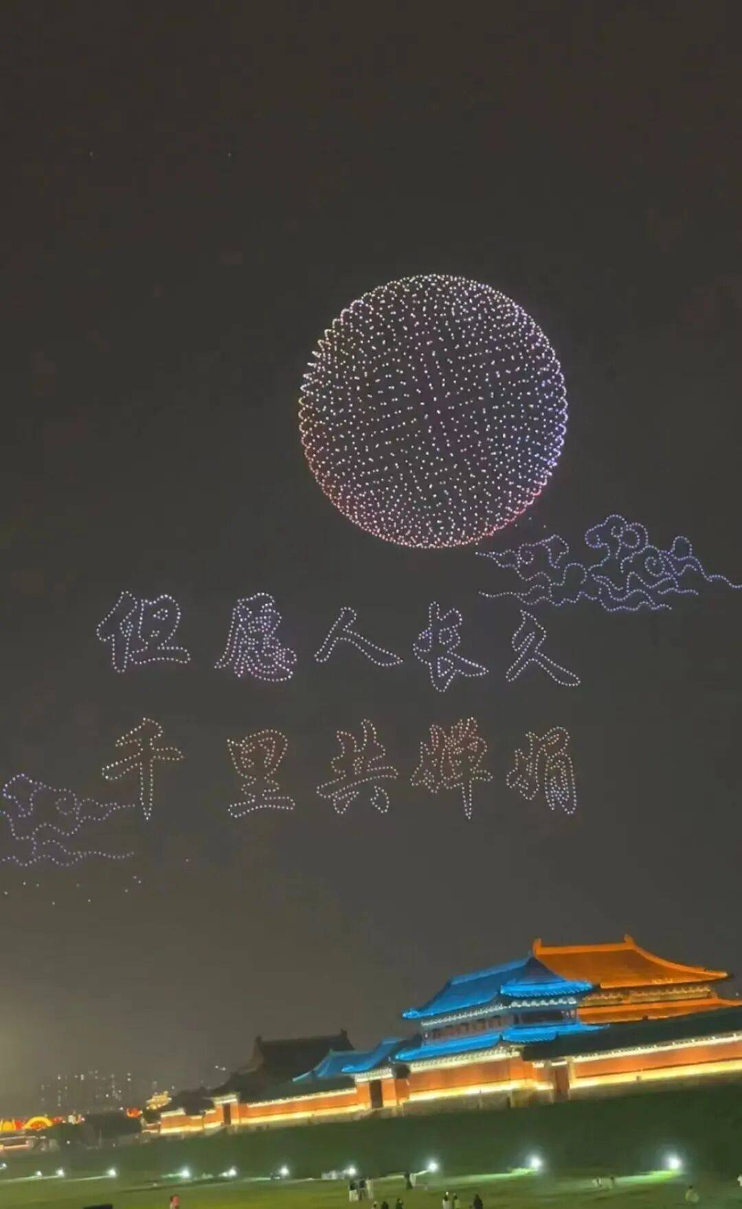 今天恰逢中秋节,天幕中玉兔与月饼的形象浮现空中,嫦娥奔月的画卷徐徐展开,明月高悬,“但愿人长久,千里共婵娟”,人们对圆满的期盼寄托在这圆月之中,精彩的表演引来观众的阵阵赞叹。20分钟无人机的表演为大同古城国庆中秋假期带来一场美轮美奂的视觉盛宴。代王府大殿绵延,灯光下的孔雀蓝殿顶宛如蓝宝石般泛出动人色泽,门前绿草坪灯光绚烂,人们在其上尽情欢笑,感受古都非凡魅力。