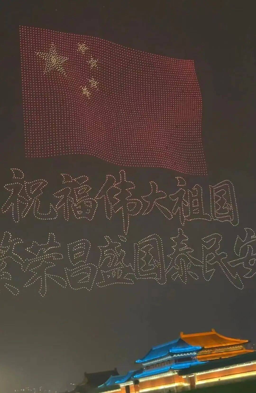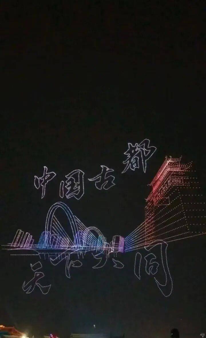 夜色浓浓,灯光刺眼明亮,这便是灯火辉煌的代王府。我们来到代王府广场,只见代王府上空的8000架无人机以夜空为幕,变幻出众多极具大同特色的图案,围绕“庆祖国华诞、展大同风采、享国庆欢乐”为主题的表演,开场的鲜红五星红旗与“祝福伟大祖国 繁荣昌盛 国泰民安”的字幕交相辉映。