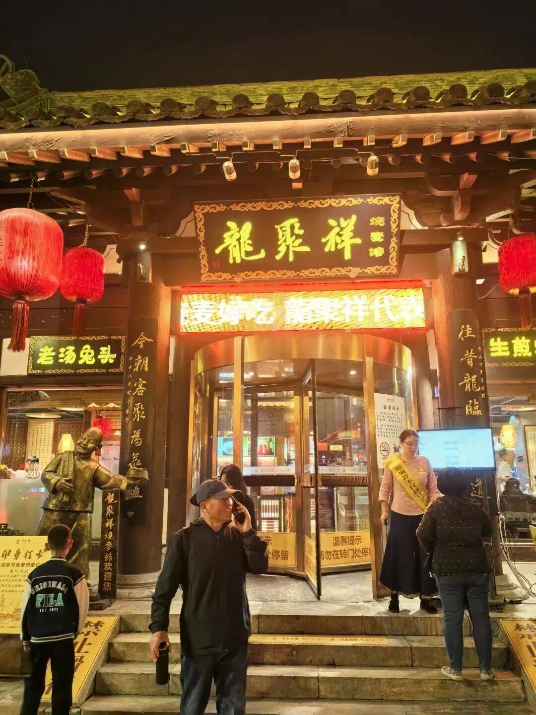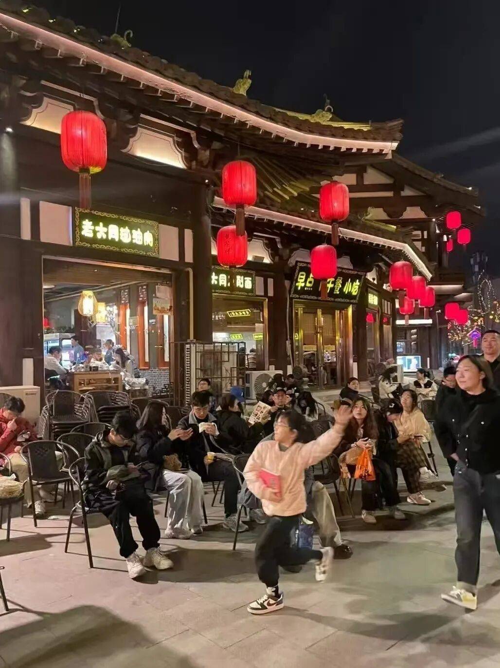 进入“鼓楼东街”门楼后,街市里又是另一番的烟花满巷——古城空巷、人潮涌动。放眼望去,无论是客店还是商铺,那木雕门楼之下,从头到尾一路悬着一盏盏的大红灯笼,那朦胧的红光和那些青砖灰瓦交相辉映,依稀仿佛使我们置身于古代,穿越到了700多年前的宋朝的街市瓦舍里。