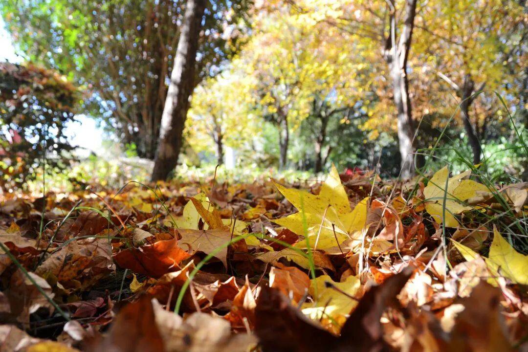 - 老图书馆西墙:爬山虎残叶与银杏形成莫兰迪色块拼贴
