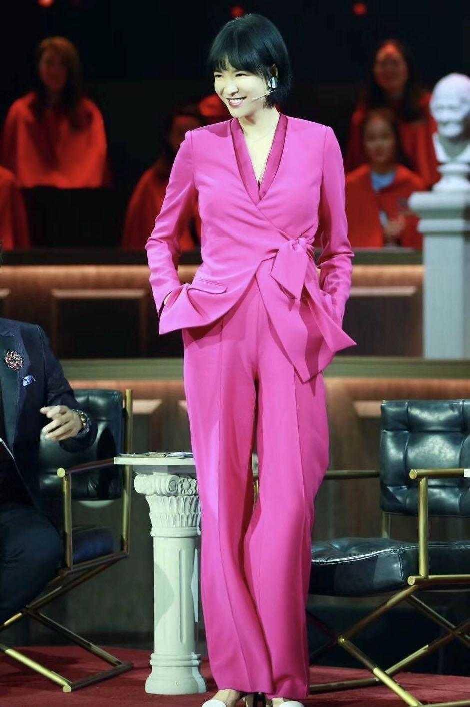李艾的这套亮粉色西服套装十分时髦,展现出她的优雅与大方,其设计并非花哨,比较契合她的个人气质。