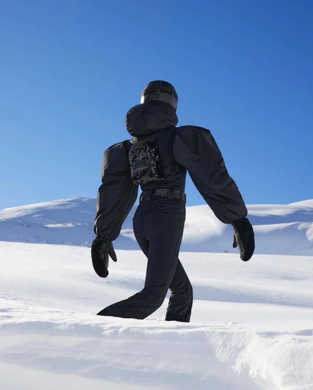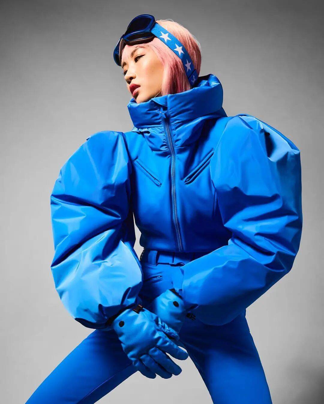个性化的廓形也能让你脱颖而出。比如将复古礼服的羊腿袖用在滑雪服上,外观立即与普通滑雪服区别开来,拍照也很出片。