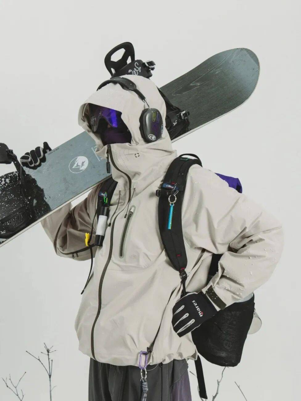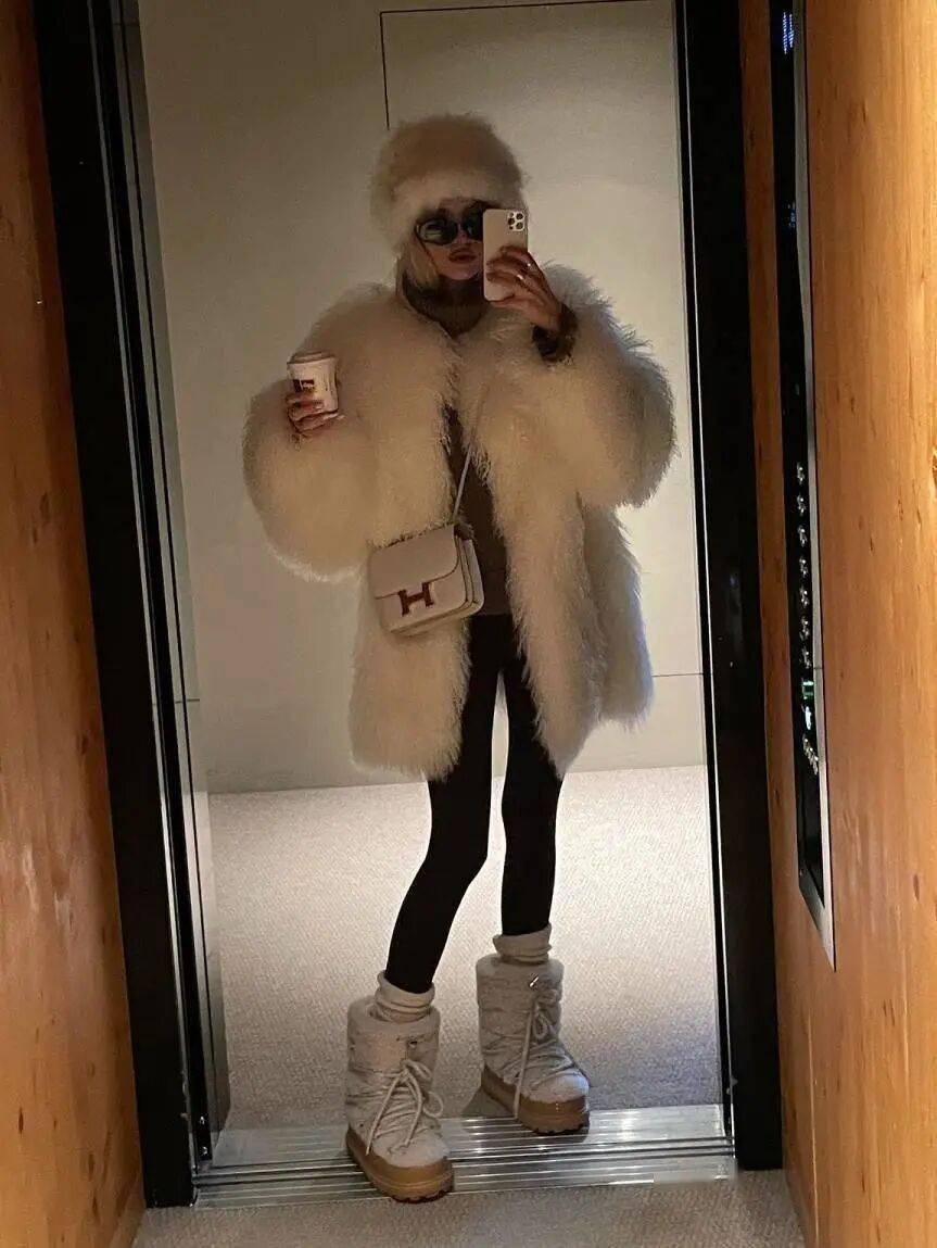 打造人设 → 搭配Moonboot雪靴、彩色护目镜、毛绒耳罩,强化整体造型记忆点