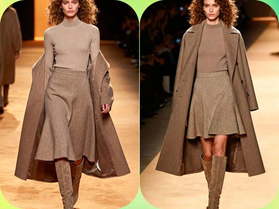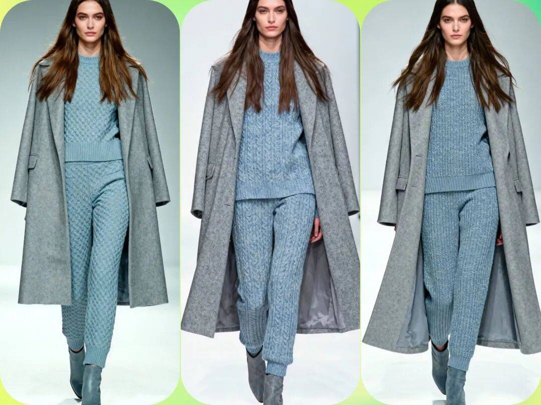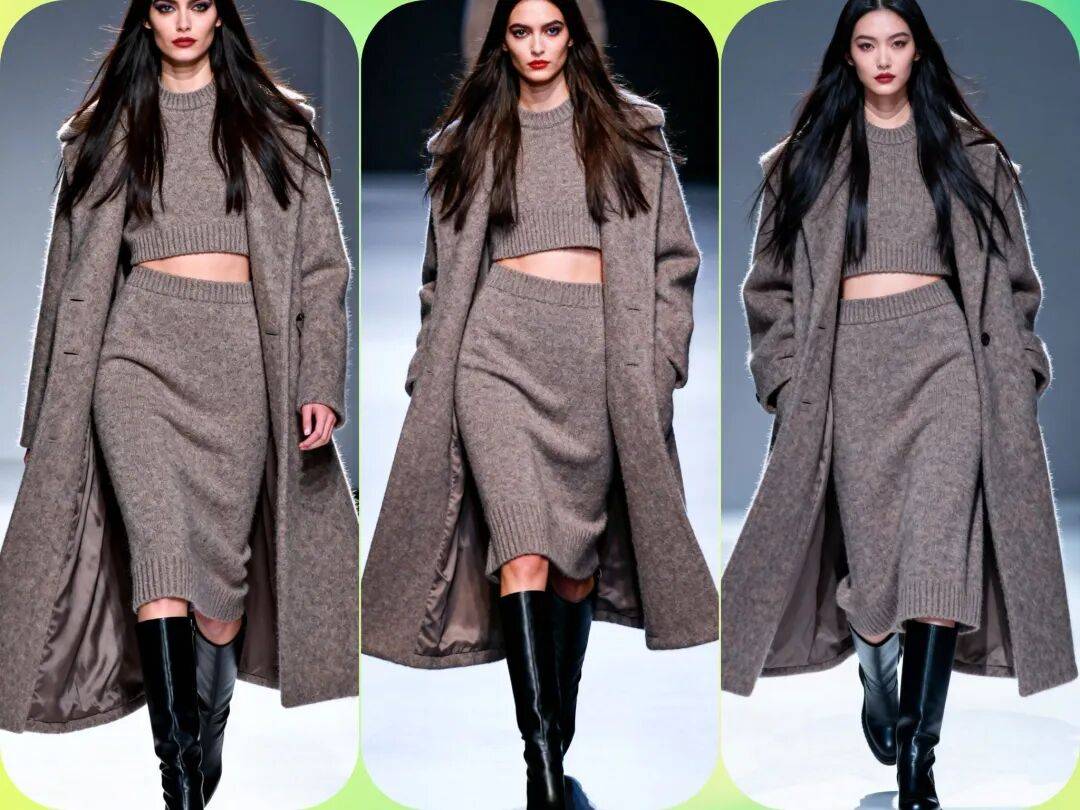 流行趋势:针织套装重回时尚中心,特别是驼色、灰色和黑色的纯色套装。纹理感强的针织材质更受欢迎。