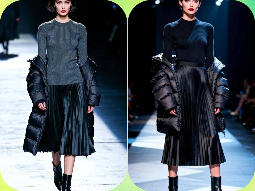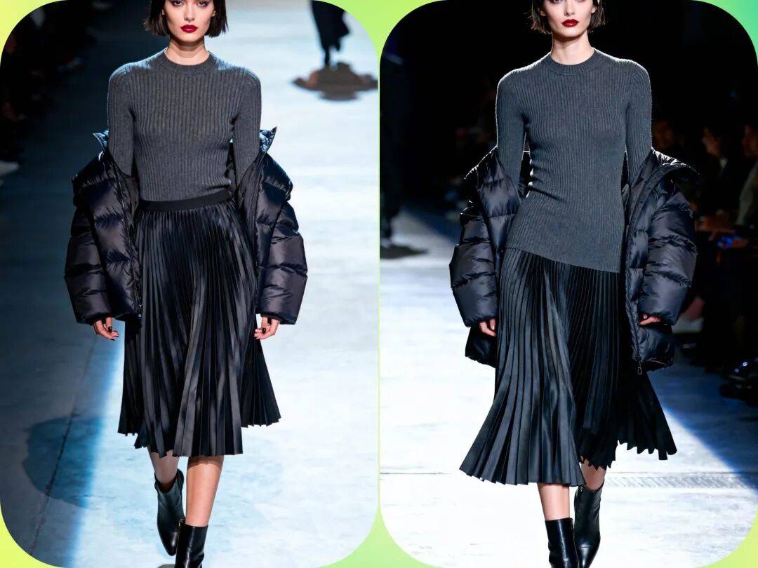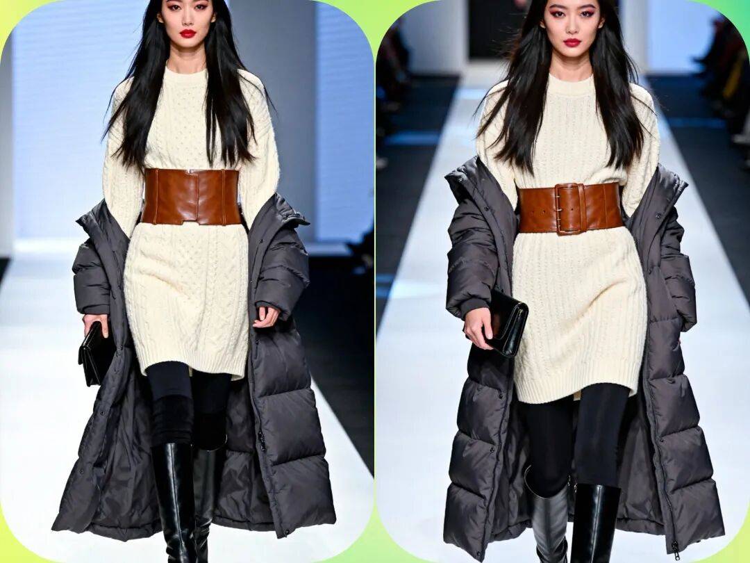 亮点展现:通过不同材质的对比(如搭配皮革外套或羽绒马甲)来打破单调感,增加造型层次。